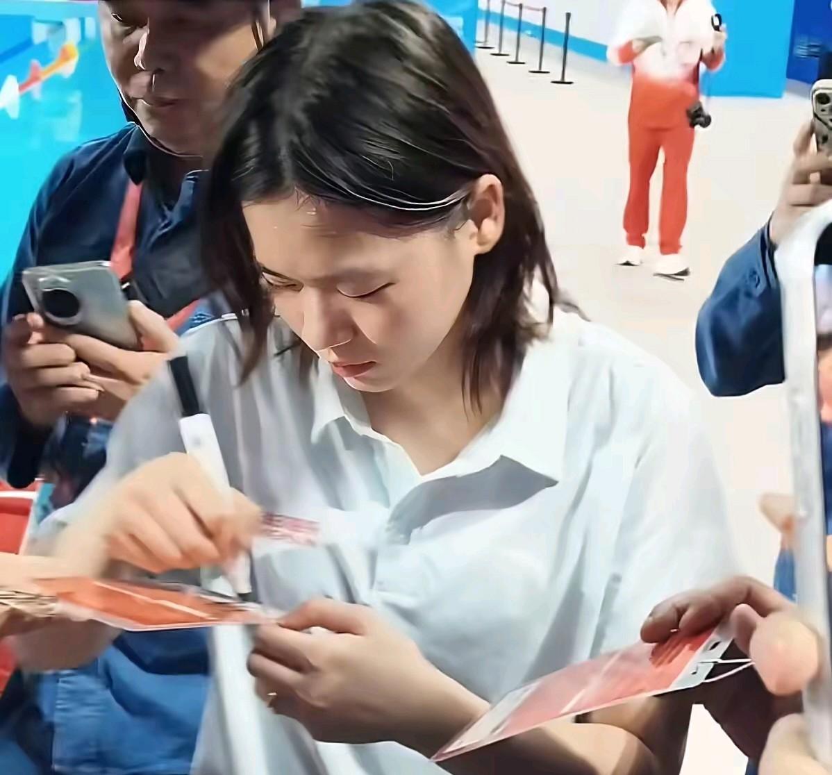 全红婵是唯一给撤场的工人伯伯们签名的运动员吧?婵妹来者不拒,认认真真在大家的工作牌上一一签名,面对围上来的人员越来越多,只是加快手上进度,没有丝毫怠慢和不耐烦 比赛刚结束,场馆里乱哄哄的。全红婵没急着走,反而留在场边给撤场工人签名。有个老师傅的工作牌带子缠住了,她耐心等着,签完还伸手帮人家把带子理好。 “这闺女真不摆架子。”老师傅举着签好名的工作牌,笑得眼睛眯成缝。队伍末尾的年轻人小声嘀咕:“我以为冠军都直接从VIP通道溜了。” 全红婵签名的样子太认真了。矿泉水瓶搁在脚边,瓶盖都没拧开。签完一个双手递回去,再接下一个。围过来的人越来越多,她只是加快速度,笔迹一点没飘。 去年在西安比赛也这样。有个小女孩在体育馆外等了三小时,全红婵出来看见,特意折返回去给她签名。保安催她上车,她边签边答:“马上马上,最后一个。” 这些细碎瞬间拼凑出真实的她——那个在奥运会上哭鼻子的小姑娘,对待普通人永远软乎乎的。 被围观的生活 但善意也会招来麻烦。去年九月她在商场吃饭,被一群人追着拍。最后躲进厕所隔间,门板被拍得砰砰响。粉丝从门缝里塞纸要签名,她缩在角落发抖。 她家新盖的房子成了网红打卡点。无人机整天在屋顶嗡嗡飞,爷爷睡不好觉。邻居偷偷抱怨:“天天堵路,摩托车都过不去。” 全红婵最近接受采访时说了句:“有时候觉得,当普通人更好。” 上个月朋友圈都在传,说她给母校捐了四百万。配图是她和湛江体校的合影,文字写得有模有样:“凌晨三点转账”、“全部奖金捐给师弟师妹换跳板”。 母校负责人直接懵了:“我们账户上没收到过这笔钱啊!” 其实跳水比赛奖金根本没那么多。世锦赛冠军扣完税就十来万,她这两年比赛收入加起来不到五十万。造谣的人却越编越嗨,又说她给西藏捐小学,给老家修公路。 发育期对跳水女孩特别残酷。全红婵长高十二厘米,重了十六斤。教练私下说过:“每重一公斤,压水花难度翻倍。” 她的招牌动作207C开始不稳定。去年全国赛连续跳砸,上岸后抱着毛巾发呆。今年五月旧伤复发,脚踝肿得像馒头。队医给她缠绷带,她疼得咬嘴唇。 这些困难从她嘴里说出来却轻飘飘的:“跳不好就多练呗。” 体育圈现在也搞饭圈那套。代拍整天蹲在运动员公寓楼下,卖签名照一张两百块。王楚钦去年发微博求粉丝:“别跟踪我了,让我好好吃顿饭。” 全红婵的哥哥更无奈。有人冒充记者上门,说要给妹妹拍纪录片,其实是直播带货。 真正的体育迷不该这样。他们记得住运动员每个技术动作,会分析转体角度入水曲线,而不是整天窥探私。 各位读者你们怎么看?欢迎在评论区讨论。