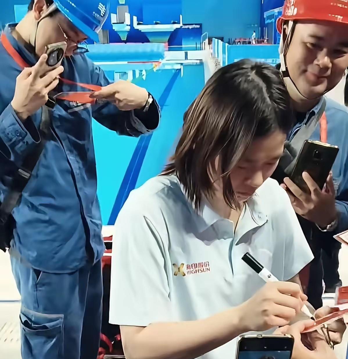 全红婵是唯一给撤场的工人伯伯们签名的运动员吧?婵妹来者不拒,认认真真在大家的工作