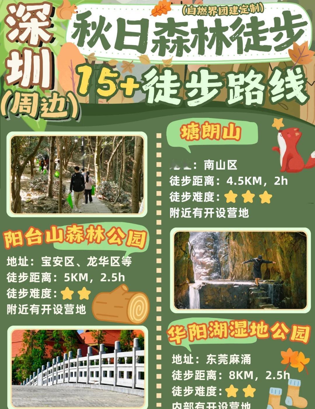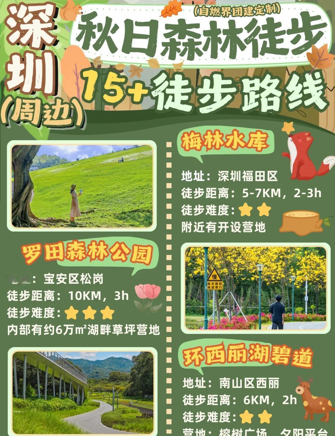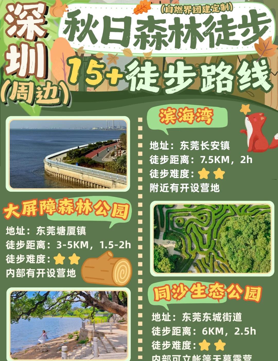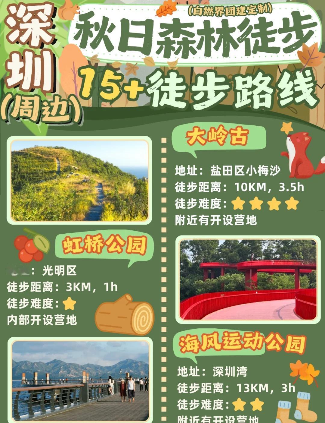 精选15+深圳周边轻徒路线✅打工人🐴住 双十一不要买买买啦! 出来找个🌳森林公园吸吸氧吧!! 👍干货分享 精选深圳及周边15条新手友好步道 2-4小时轻量化徒步,罗田森林/马峦山/虹桥公园亲测出片又解压! . 【为什么选择户外徒步】 🙆♀️活络久坐筋骨缓解肩颈酸痛 🌳自然疗愈释放工作压力 🧊团队破冰增强部门凝聚力 . 【秋冬团建推荐组合】 🧑🦯徒步+🍵围炉煮茶(养生局必备) 🧑🦯徒步+🪘非洲鼓创作(氛围感拉满) 🚴环湖骑行+🏕️露营烧烤(趣味性满分) . 【活动概括】 ⏰活动时间:2-4小时 📍活动地点:深圳周边 🔸活动人数:30人起 🔸活动调性:休闲 | 养生 | 活络筋骨 |趣味 . 【推荐路线】 📍深圳: 🔹罗田森林公园 🔹环西丽湖碧道 🔹雪竹径绿道 🔹马峦山郊野绿道 🔹香蜜公园 🔹大岭古 🔹虹桥公园 🔹海风运动公园 🔹梅林水库 🔹塘朗山 🔹阳台山森林公园 . 📍东莞: 🔹华阳湖湿地公园 🔹滨海湾 🔹大屏障森林公园 🔹同沙生态公园 . 【户外徒步注意事项】 ①防晒防虫,着装分层,带足水与应急物品 ②安全至上:行程告知家人,备足水粮与应急物资 ③物理防晒,分层着装,备足饮水与应急用品 . 【更多秋冬主题团建】 🍵围炉煮茶 | 🌈秋日多巴胺运动会 | 🍖露营烧烤 📖玩霸江湖 | 💰古镇寻宝 | 🍽️寻味岭南定向 🌆城市生存赛 | 🚴秋日骑行 | 🥏飞盘主题团建 户外徒步 企业团建 团建策划 轻松徒步路线 徒步路线推荐 一起徒步户外吧 深圳徒步 团建 广东团建策划