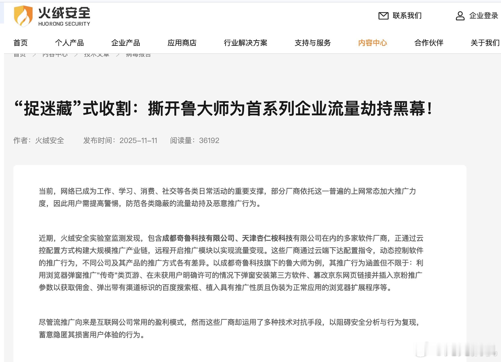 这也太贼了!鲁大师被曝“云控”推广!火绒安全点名鲁大师及关联公司,疑似利用“云控”技术在用户电脑上搞小动作!他们能按你的地理位置和用户类型“精准”投放!疯狂弹广告、篡改浏览器主页。网购时偷偷跳转到“奇怪”链接,甚至静默安装软件...更可怕的是,还会识别你是不是“技术用户”,可能区别对待!建议立刻检查电脑里是否安装了鲁大师及其相关组件(如节能降温、清理加速等),果断卸载!