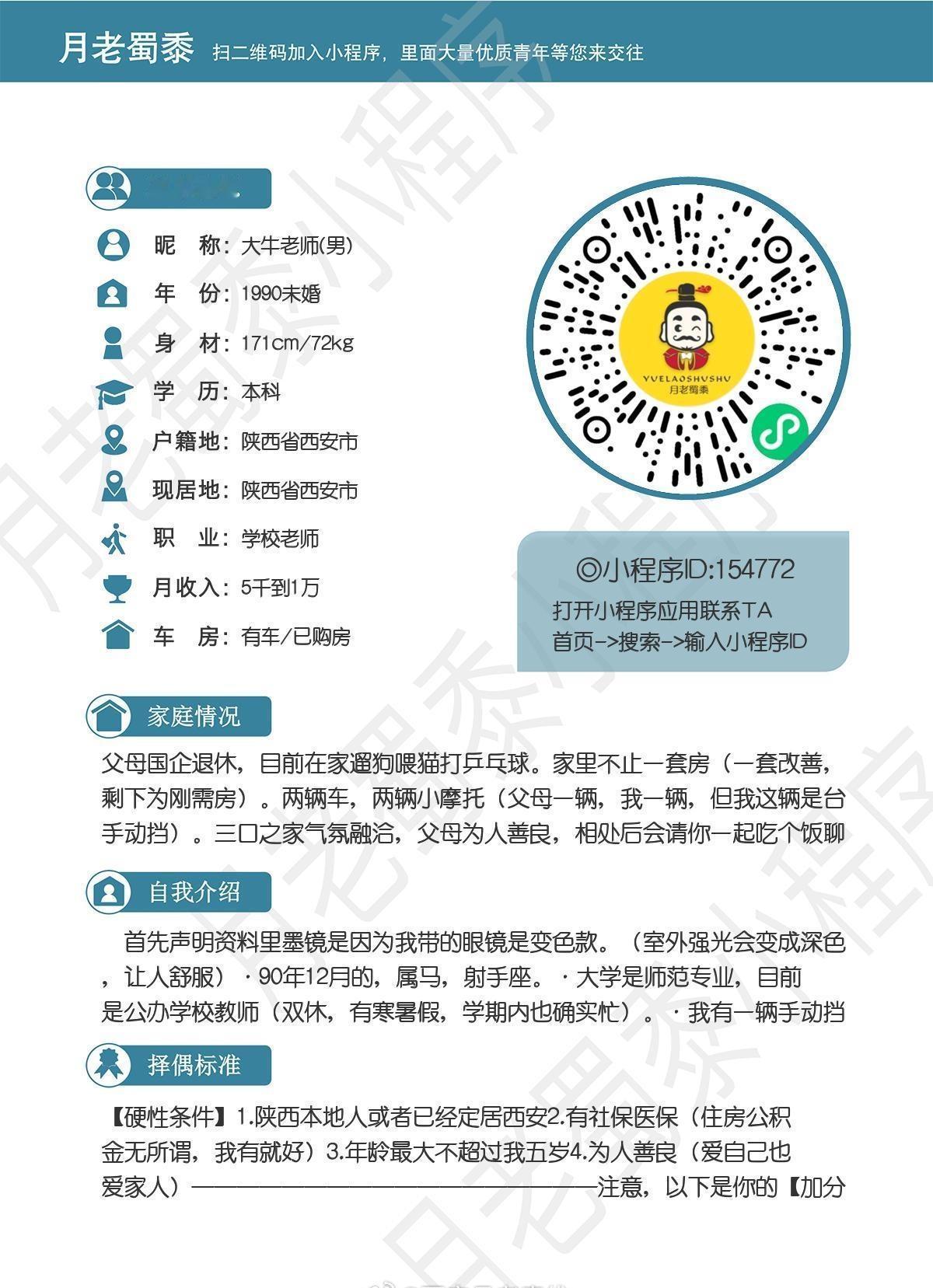西安交友征婚 男嘉宾👦,90年未婚,独生子,身高171 本科,学校老师,已购房🏠,有车🚗 父母国企退休 详细资料和生活照进小程序搜索🔍154772 非诚勿扰