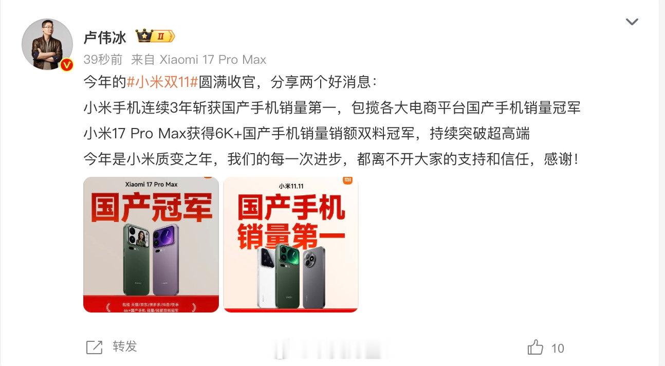 今年双十一小米的战报来了!几个数据还是非常亮眼。1、全渠道累计支付金额达290 亿,多个品类霸榜电商平台;累计支付金额连续3 年超 200 亿;2、手机垂类,小米手机拿下天猫、京东、拼多多等主流电商平台销量冠军,这已经是连续三年获国产手机销量第一了,其中小米17Pro Max摘下天猫、京东主流电商平台6K+以上国产销量冠军,还是非常能打的。3、小米除了手机,现在的人车家生态也是全面开花,很多人都在这个双十一选购了小米的家电等产品;现在小米的生态体系已经成为了小米品牌非常强大的护城河了