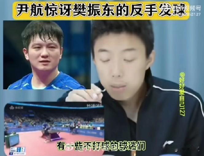 尹航直播说:你们不打球,不知道樊振东有多可怕。 他在发球轮次, 接发球轮次。 发了十个球, 没有一个是一样的。 接了十个球, 没有一个是一样的。 你就算研究透他, 也防不住他。 外行人不懂这含金量, 打球的都认可樊振东!