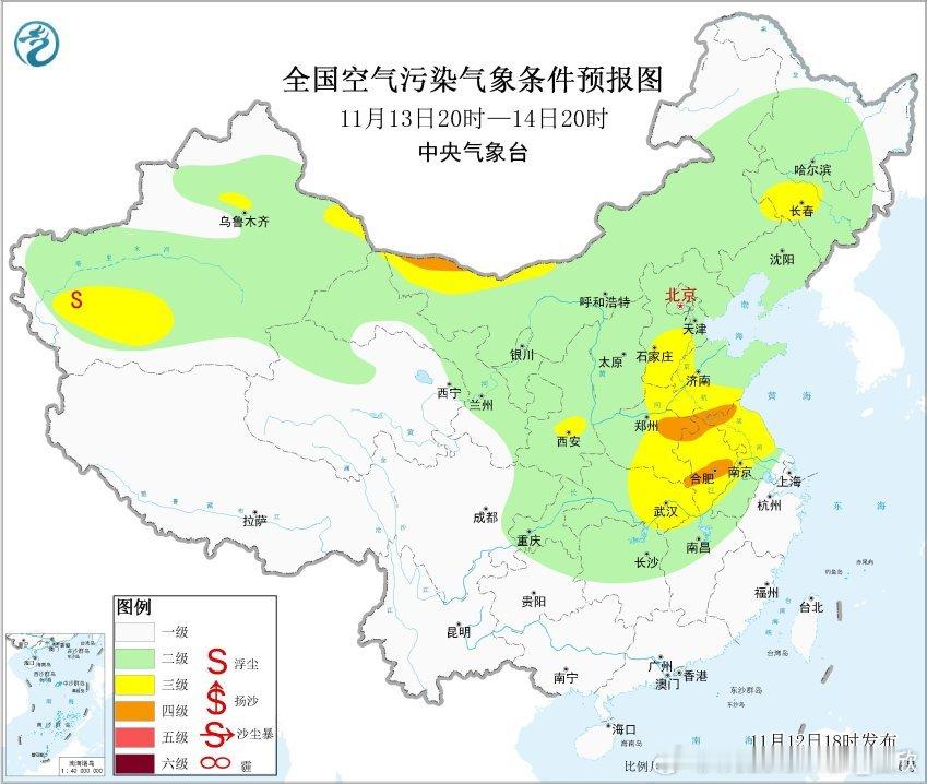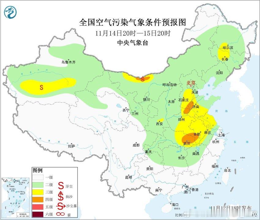 【霾】从今天11时-14时-17时的空气质量看,在冷锋附近和前侧,出现了一定程度的空气污染。今晚到明天,冷空气继续东移南下,使得污染向东向南传输。之后14-15日,污染还会在华北南部、黄淮、江淮等地堆积,导致有霾。16日以后有强冷空气东移南下,霾将被清除。另外在冷空气活动间歇,15日晨在京津冀、江苏等地可能出现大雾。
