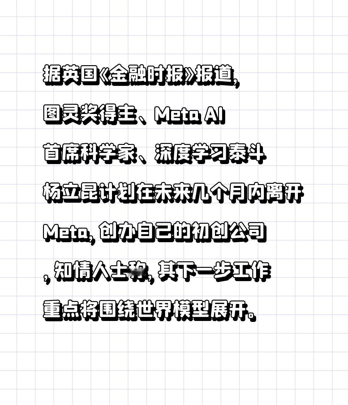 AI泰斗杨立昆将离开Meta,投身“世界模型”创业 据英国《金融时报》报道,人工智能领域的旗帜性人物、图灵奖得主杨立昆(Yann LeCun)计划在未来几个月内辞去Meta首席AI科学家一职,以创办自己的人工智能初创公司。据悉,新公司的核心任务将聚焦于开发一个先进的“世界模型”,这标志着这位深度学习先驱正开启其职业生涯的新篇章。 所谓“世界模型”,其目标是让机器能够像人类一样,通过观察来理解和预测现实世界的运行规律。它不仅限于识别静态图像或文本,更要能构建一个关于世界如何运作的常识模型,从而理解因果关系、进行逻辑推理,并预测未来可能发生的事件。例如,看到乌云密布,模型应能“推理”出可能会下雨,以及下雨将对周围环境产生的一系列影响。杨立昆曾多次公开强调,当前仅基于大量文本训练的AI系统存在根本性局限,无法获得真正的智能。他认为,实现更高级人工智能的关键,在于构建这种能够学习世界底层逻辑的模型,这被视为通向通用人工智能(AGI)的一条核心路径。 因此,杨立昆的此次创业动向,不仅是他个人研究方向的深化与实践,更可能对整个AI领域的发展轨迹产生深远影响。他选择离开资源雄厚的Meta独立创业,也反映出他认为在探索AGI的“下一座大山”时,初创公司的敏捷性与专注度或许更具优势。此举无疑将为如火如荼的AI竞赛,尤其是AGI的终极追寻,增添一个极具分量的新变量。
