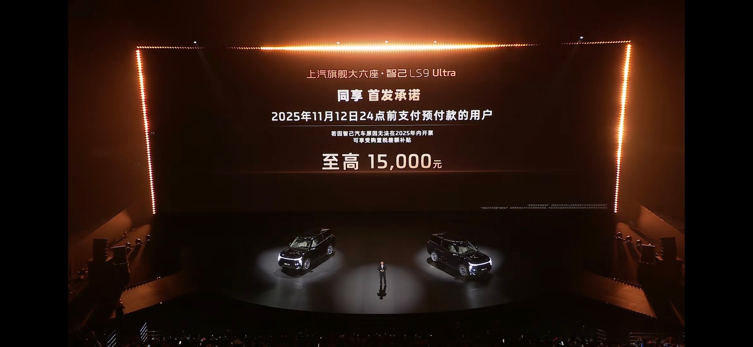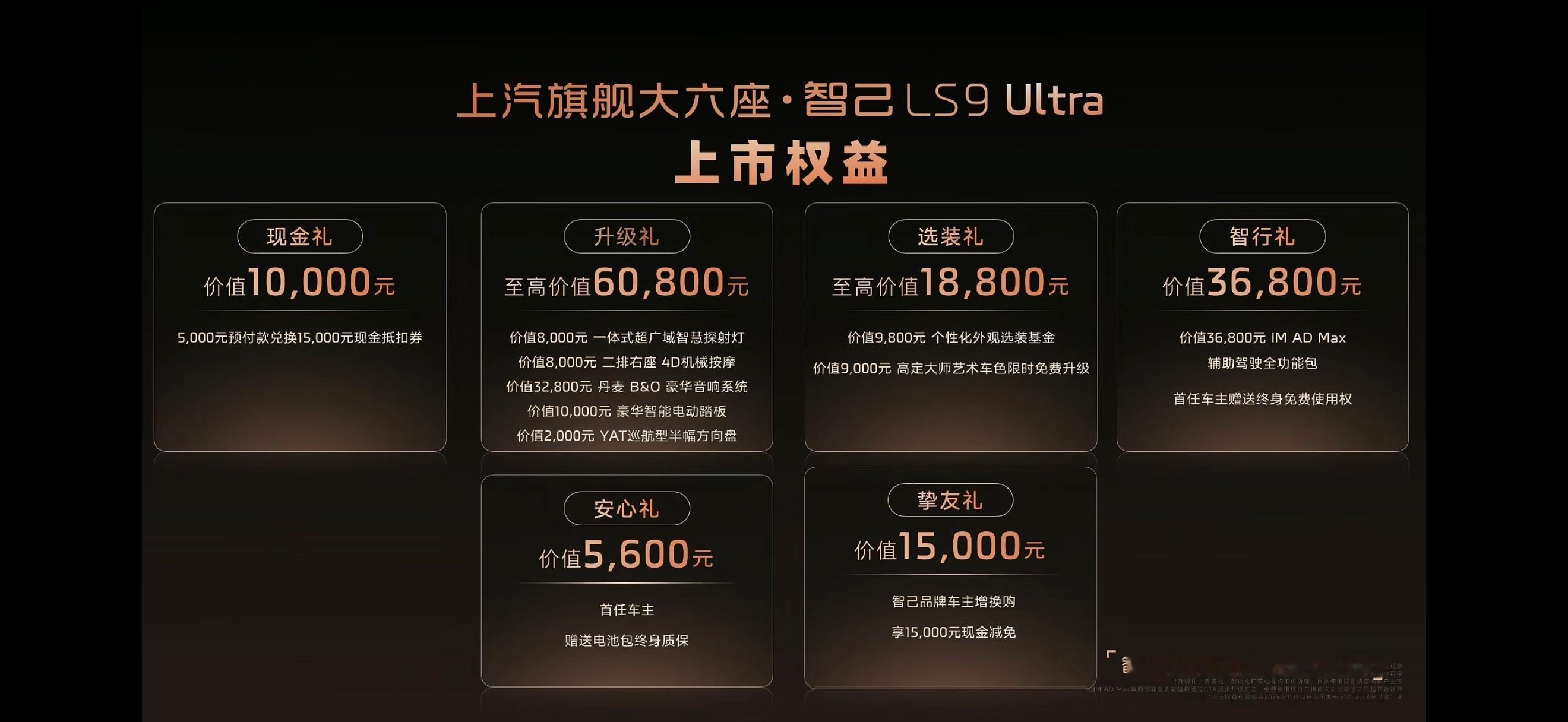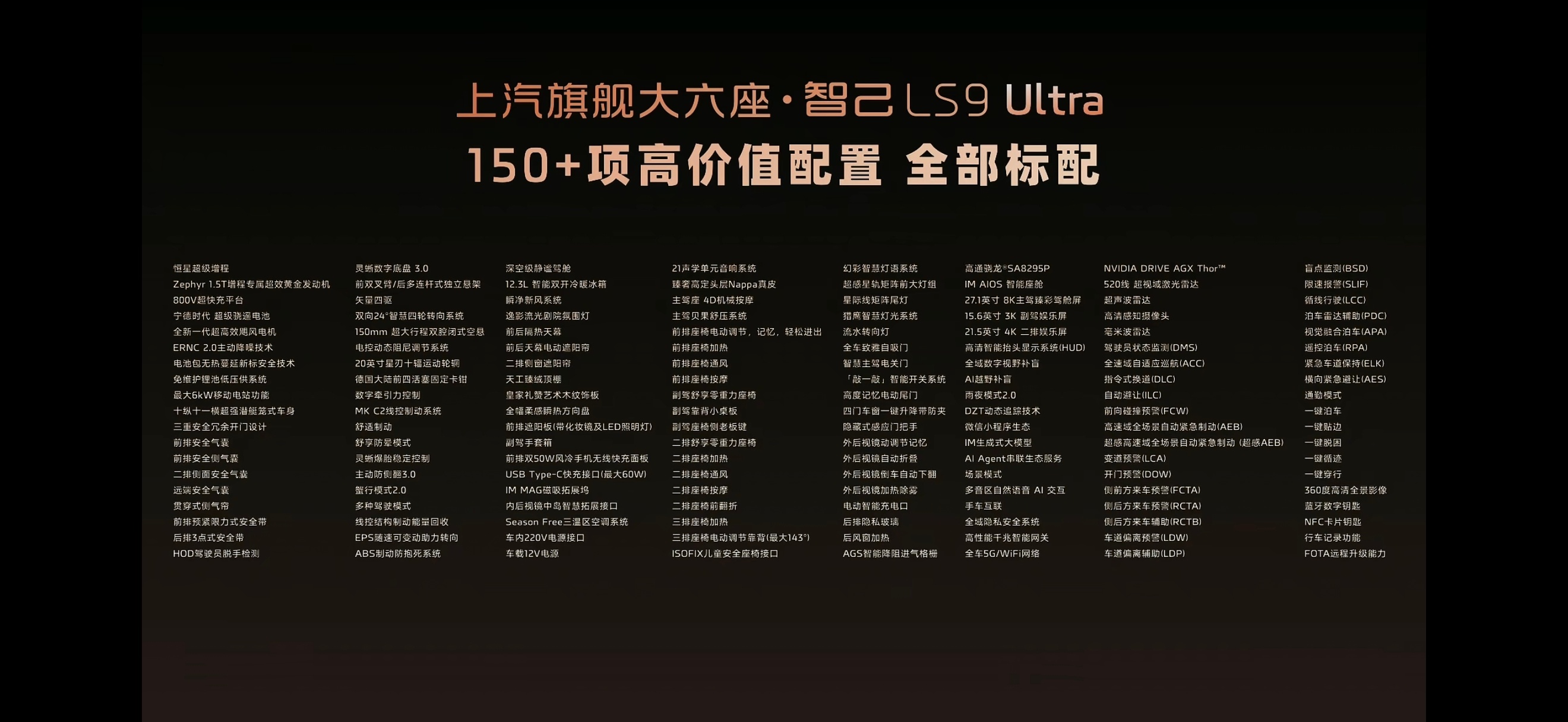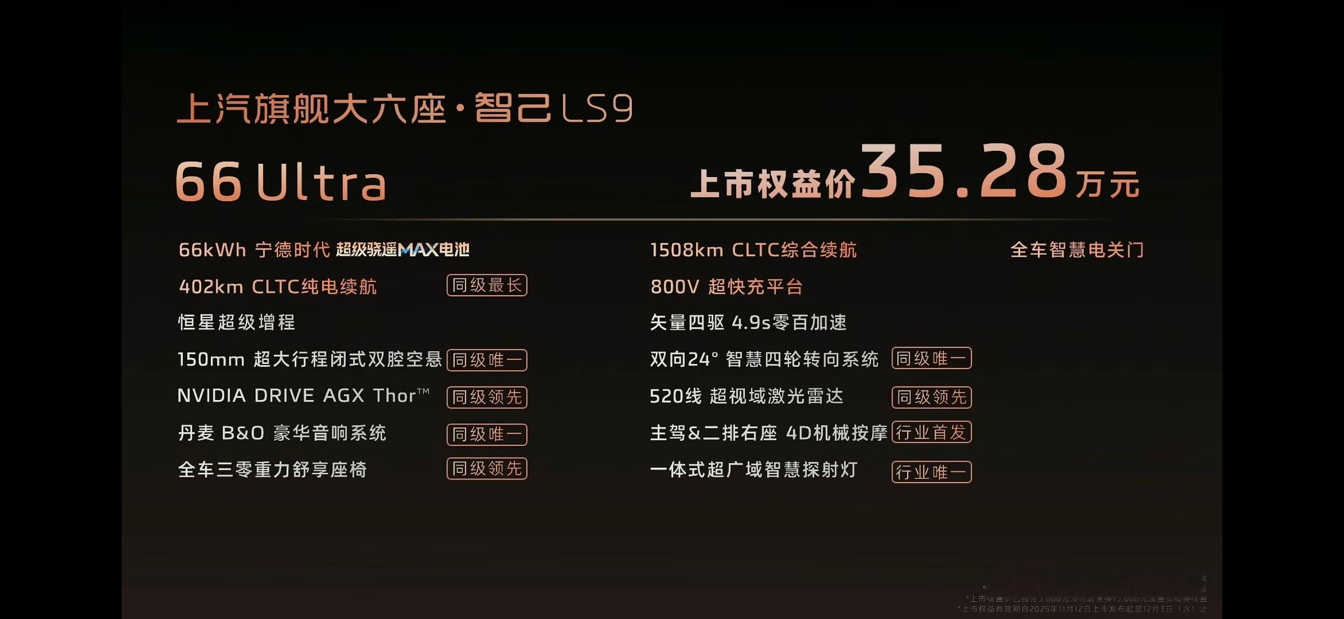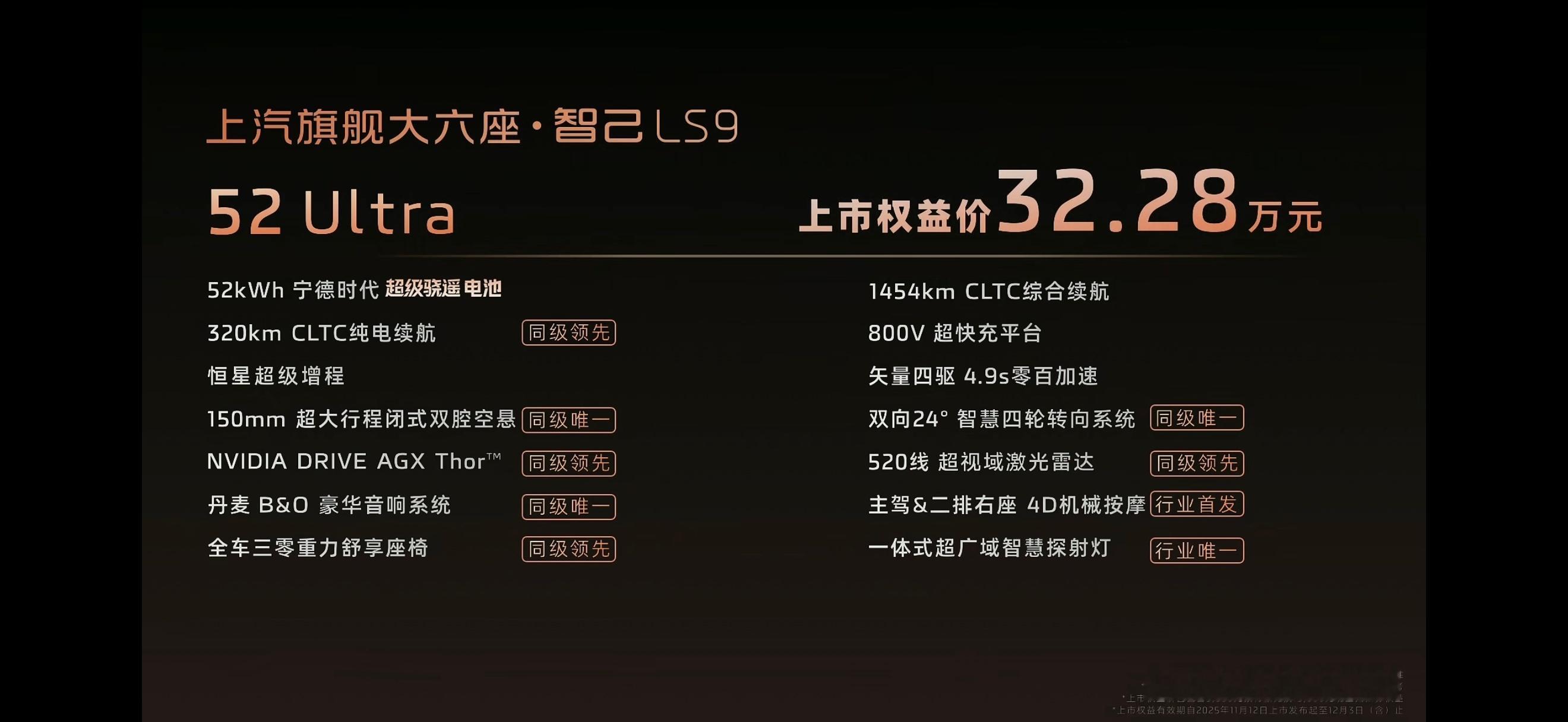 智己汽车全新旗舰车型 —— 智己LS9正式上市,新车公推出两款配置车型, 52Ultra 指导价33.28 万元,66Ultra 指导价36.28 万元,上市权益价分别为 32.28 万元和 35.28 万元,新车将于 11 月下旬正式开启交付。此外,智己LS9还有一款Hyper车型,搭载全线控转向系统以及高性能三电机矢量四驱系统,目前已完成车辆的验证和测验,待新的法规发布即可上市,预计与2026年第一季度发布。智己LS9作为定位大型 6 座 SUV 的旗舰产品,车身尺寸方面,长宽高分别为5279/2000/1806mm,轴距 3160mm,座舱采用2+2+2式6座布局。新车搭载 “恒星” 超级增程技术与灵蜥数字底盘 3.0。外观方面,智己LS9采用全新设计语言,整体造型方正大气。前脸采用封闭式前格栅,搭载2.4 米星环式贯穿前大灯组与猎鹰智慧灯光系统带来了辨识度,前风挡上方可选装一体式探射灯,夜间视野大幅拓宽。封闭式前格栅下方设有梯形进气口及镀铬装饰条,兼顾时尚感与精致感。车身侧面采用游艇式流畅线条,隐藏式门把手与电动侧踏板提升便捷性,提供 20 英寸星刃十辐、21 英寸星耀多辐、22 英寸星冕镜面(带悬浮轮心盖)三款轮圈可选。车尾贯穿式尾灯组支持智慧灯语系统,配合大尺寸扰流板与隐藏式排气布局,尾部 “敲一敲” 开关功能更显灵动。车身提供奥林匹斯黑、高加索灰、波罗蒂蓝、乔戈里银四款车漆配色。内饰方面,智己LS9采用了全新家族式布局。内饰提供大地象灰深/浅两套内饰主题,以 Nappa 真皮、皇家礼赞艺术木纹饰板、巴洛克渐变浮雕绗缝及加尼叶金装饰,营造精致豪华氛围。前排屏幕配置为27.1 英寸 5K MiniLED 中控双联屏 + 15.6 英寸 3K MiniLED 副驾娱乐屏,以及HUD 抬头显示系统。智能座舱搭载高通骁龙 SA8295P 芯片与 IM AIOS 系统,支持多音区语音交互、手机互联,创新配备 AI 越野补盲、定制 360 越野影像、雨夜模式 2.0、DZT 动态区域追踪等功能,复杂路况从容应对。车内采用 2+2+2 式 6 座布局,前排座椅标配电动调节、记忆、加热、通风与 4D 机械按摩,第二排搭载独立座椅,副驾及二排座椅均支持零重力模式。二排座椅配备腿托、可调节内侧扶手(集成通风 / 加热 / 按摩物理按键),还设有储物槽、小桌板与 USB 充电接口,副驾座椅可向前翻折,前排座椅靠背能完全放平,与后排形成躺椅模式。三排座椅支持 143 度电动调节与加热功能。二排最大腿部空间 1207mm、膝部空间 265mm,三排头部空间 955mm、坐垫深度 515mm。此外,车内还是配备了大尺寸吸顶屏、前后隔热天幕 + 电动遮阳帘、二排侧窗遮阳帘、双层静音玻璃,全系标配 12.3L 智能冷暖双用冰箱(温度范围 - 6℃至 50℃),25 扬声器 7.1.4 声道 B&O 音响(总功率 3472W)+ 15 条氛围灯带(支持观影沉浸式联动)。智己LS9还提供IM MAG磁吸拓展坞,用户可以在智己App商城购买磁吸拓展支架Pro、磁吸随行美妆镜、磁吸香氛、磁吸魔术储物盒、磁吸纸巾袋、磁吸眼镜盒等装备。还可选装野奢户外套装全方位满足舒适出行需求。辅助驾驶方面,智己LS9全系标配 520 线超视域激光雷达与英伟达 Thor 芯片,搭载 Momenta 赋能的 IM AD Max 系统,提供 ACC 全速自适应巡航、ILC 自动避让、AEB 高速域全场景自动紧急制动等基础功能,支持城市/高速高架领航辅助、代客泊车等全功能包。动力方面,全系标配 800V 超快充平台,搭载 搭载高性能版 “恒星” 超级增程系统,增程器最大功率 114 kW,配备新一代 VGT 可变截面涡轮增压器,52Ultra车型系统综合最大功率 380kW,66Ultra车型达 390kW,峰值扭矩均为 670N・m,0-100km/h 加速仅需 4.9 秒。匹配宁德时代骁遥电池组,52Ultra车型为52kWh磷酸铁锂骁遥电池,CLTC 纯电续航320km,综合续航1454km;66Ultra车型为66kWh三元锂,超级骁遥电池CLTC 纯电续航402km,综合续航里程1508km,10%-80% 快充时间分别为19 分钟和 16.5 分钟,油电综合折算能耗低至 2.81L/100km。底盘方面搭载灵蜥数字底盘 3.0,配备双向 24° 四轮转向、150mm 智能双腔闭式空悬、前双叉臂后多连杆悬架与矢量四驱系统,同时拥有爆胎稳定控制、主动防侧翻 3.0、蟹行模式 2.0 等功能,操控与舒适性兼顾。被动安全采用十纵十一横超强潜艇笼式车身,搭配三重安全冗余开门设计,全方位守护出行。