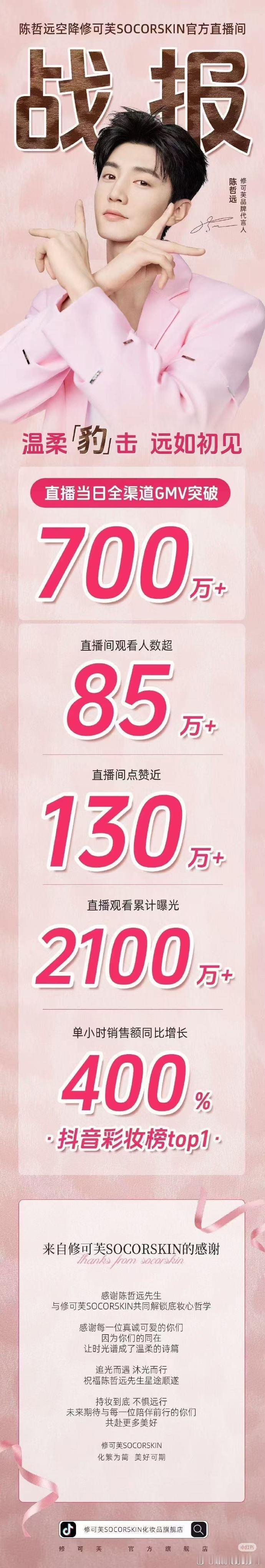 陈哲远空降修可芙直播间战报全渠道GMV直接突破700万+❗️直播间观看人数85万+❗️直播间点赞130万+ ❗️直播间累计曝光量2100万+ ❗️最绝的是单小时销售额暴涨400% ❗️直接登顶抖音彩妆榜TOP 1🔥陈哲远有效播剧