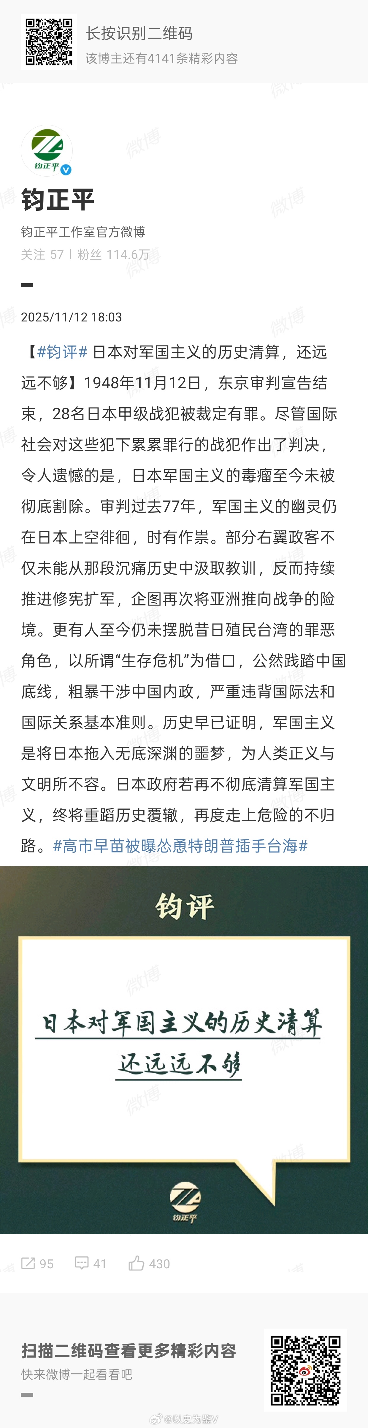 钧正平:日本对军国主义的历史清算,还远远不够。我觉得日本清算不够就不够,因为要让日本自己清算自己,不是不可能,是根本不可能;能让日本军国主义彻底进行历史清算的,恐怕只有邱小姐驾临后,在驻日pla的监督之下才有可能