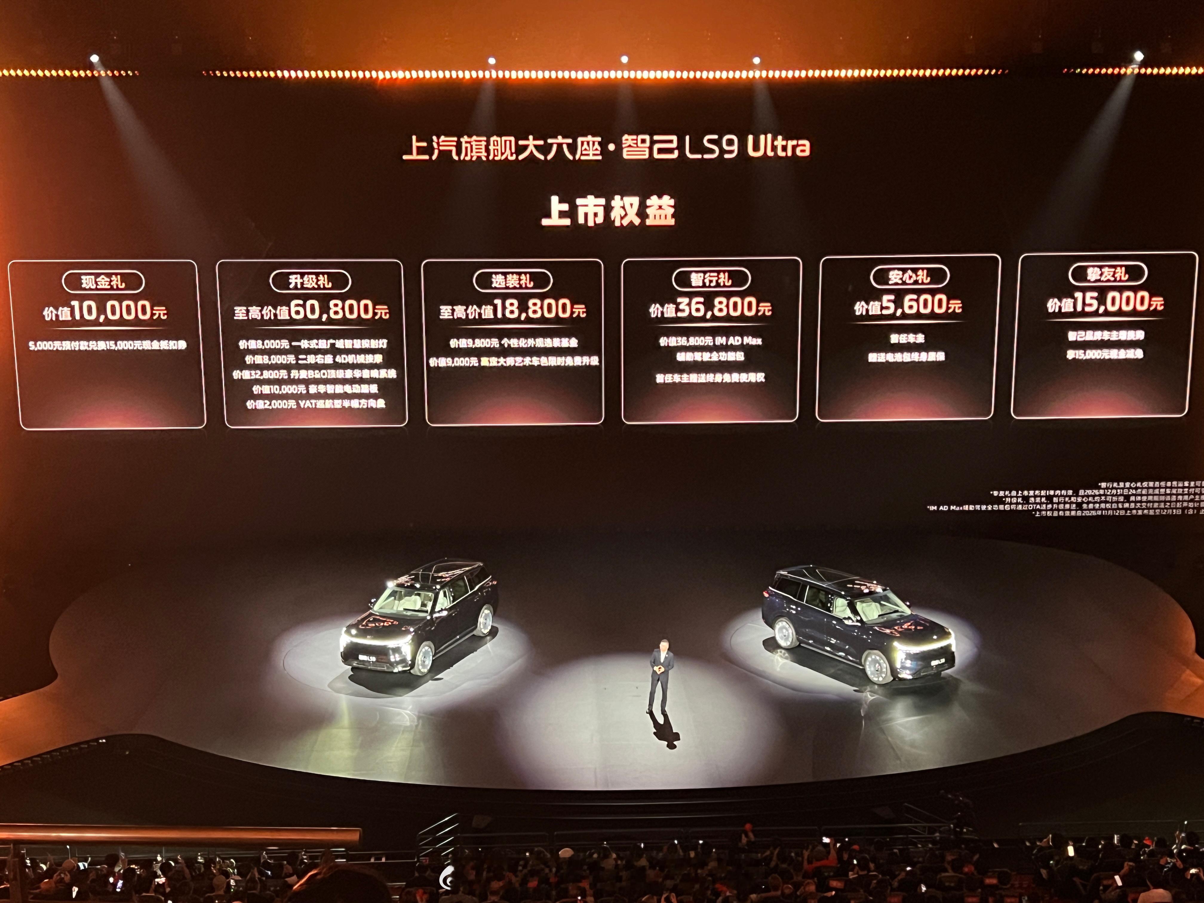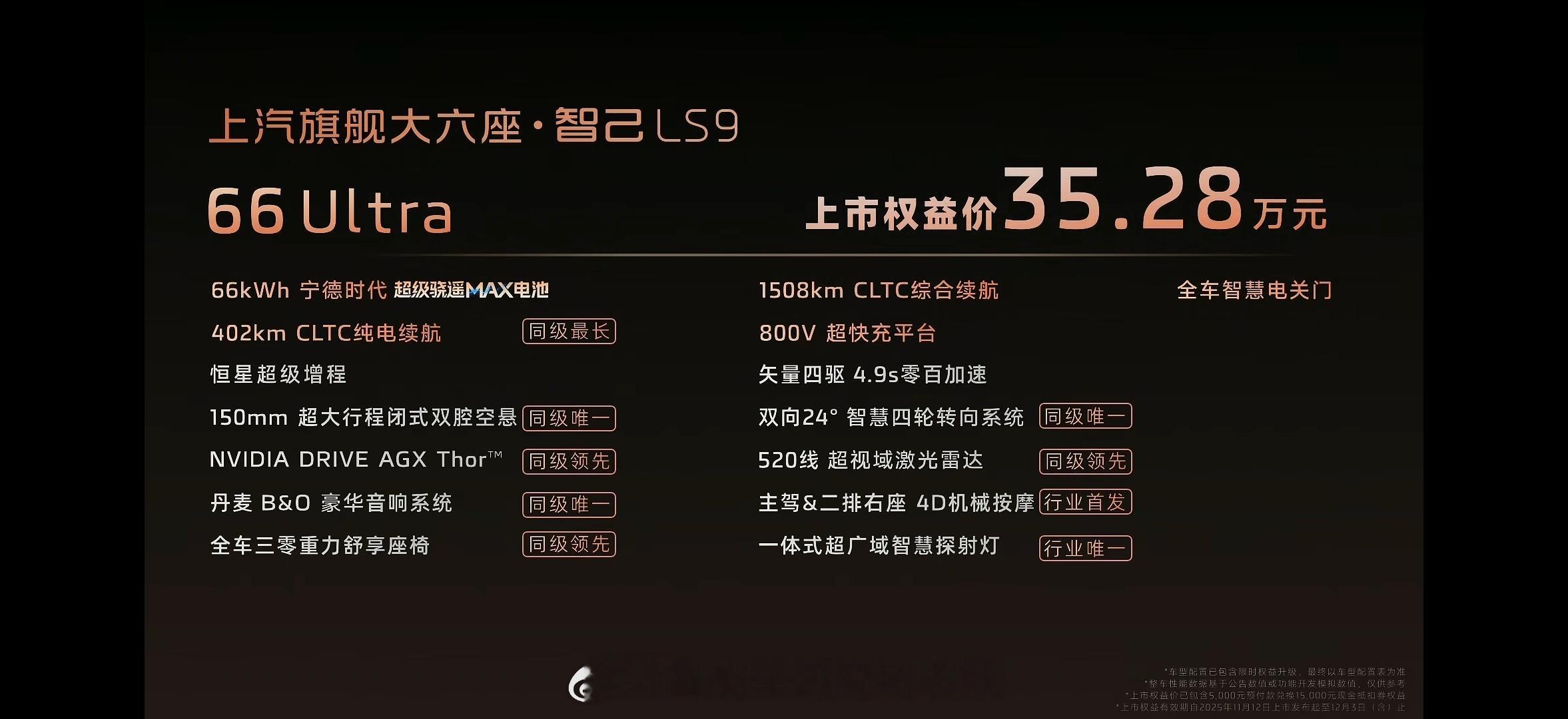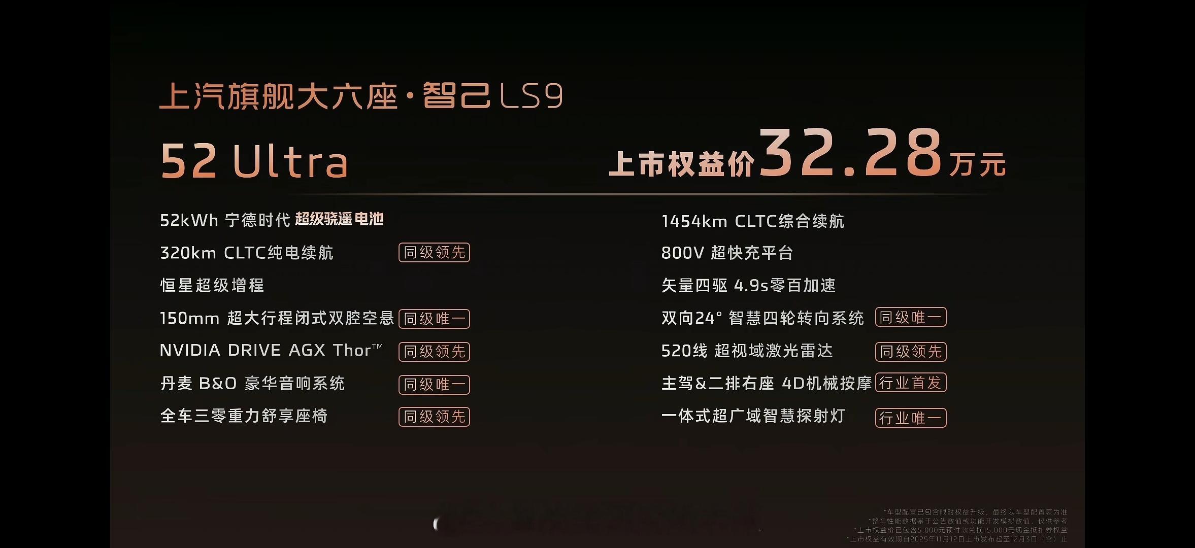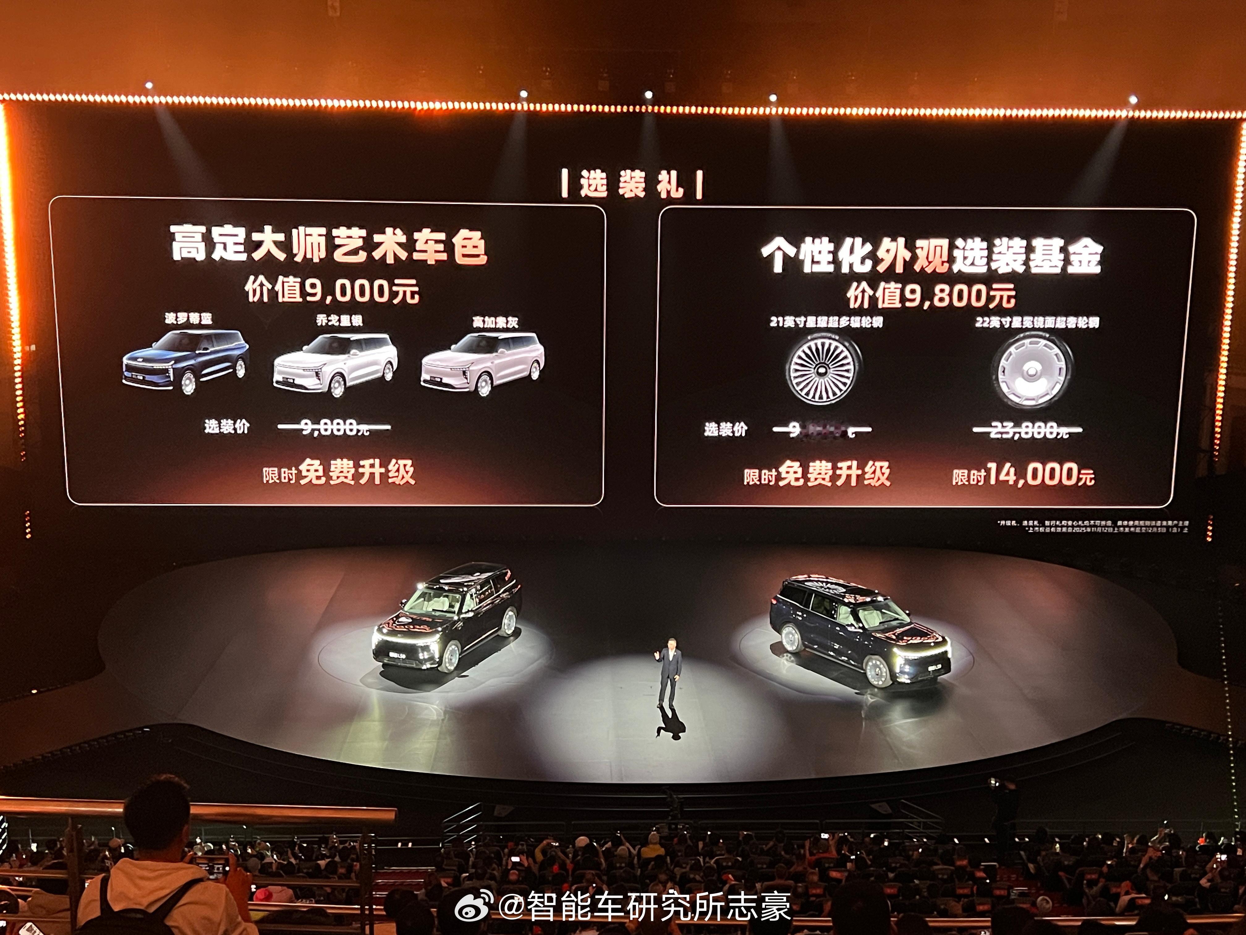 好离谱啊 智己LS9,合着价格比上市预售便宜之余,之前看颜色,轮毂要钱的,现在直接送到21寸(22寸大饼轮毂14000),电动踏板,BO音响,空悬,冰箱沙发彩电啥都有了30w出头真的可以拿下入门版了:也就不选大电池,外加叠加一些上市福利权,真的好xx离谱,这价格连个大五座YU7 max都卖不到,竟然是买到了9系列。所以实车体验,有些小小细节用料不够顶(用料猛的程度,跟9x还有点差距),现在通过配置和价格答案都浮出水面了:到底要做个上汽最尊的9系列,价格平平;还是价格超惊喜呢,智己选择了后者,狠狠滴用价格去拼刺刀,这次真的是不成功变成仁了。