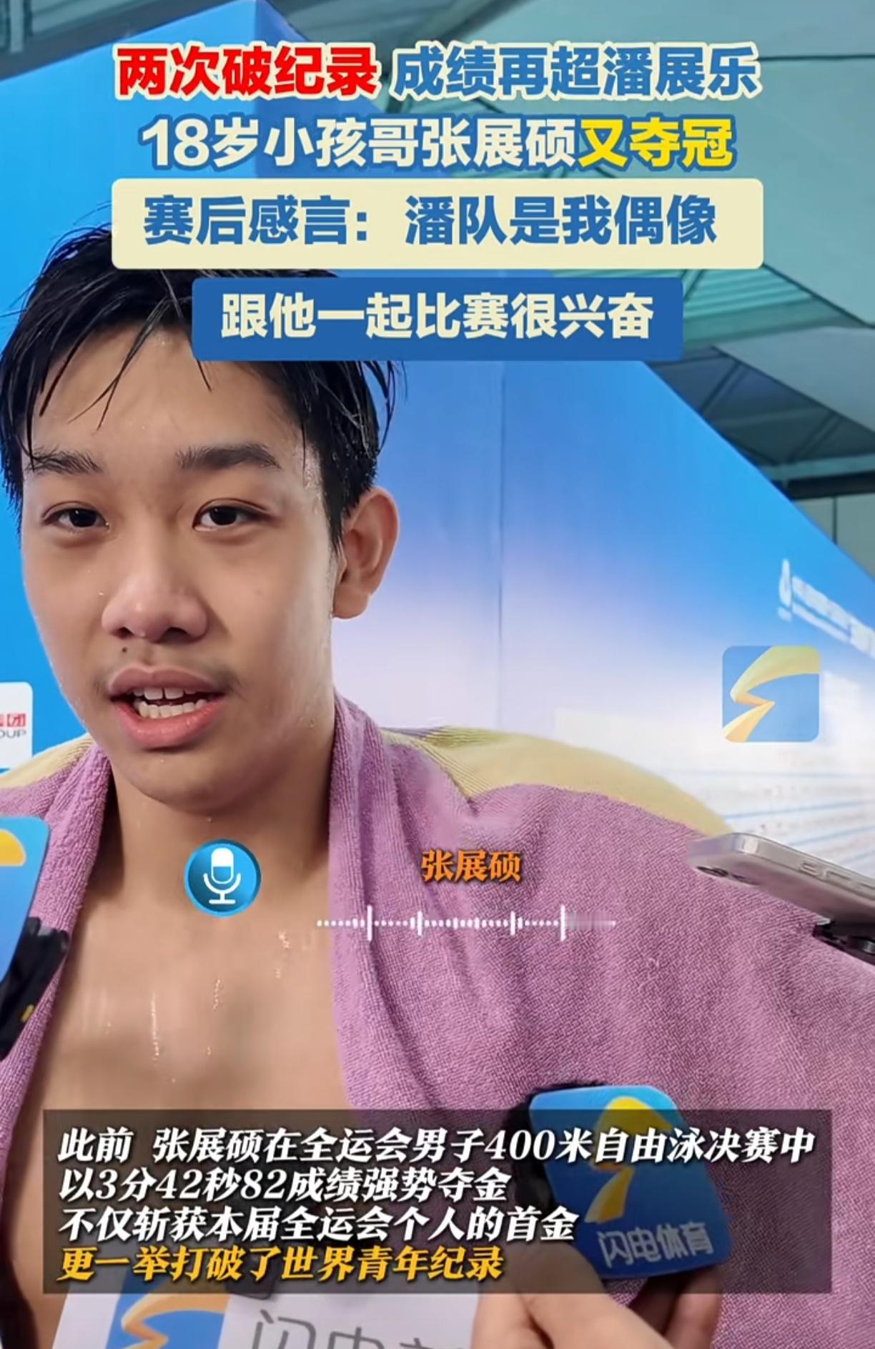 我宣布, 以后坚决不看张展硕比赛了, 不是因为他尬,也不是因为无聊,而是因为实在太上头了,全程刺激又紧张! 全运会200米自由泳决赛,他1分44秒86夺冠,直接把潘展乐甩在后面,之前世锦赛接力还游出全队最快分段,这小子哪来的劲儿,看得人心脏直跳。 冠军赛他发着38.5度高烧退赛,第二天硬撑着上200米自由泳拿银牌,第三天800米自由泳又第一,发烧拉肚子还能连拿奖牌,这状态起伏比过山车还猛,看得人直冒汗。 这小子以后比赛还让不让人活了?