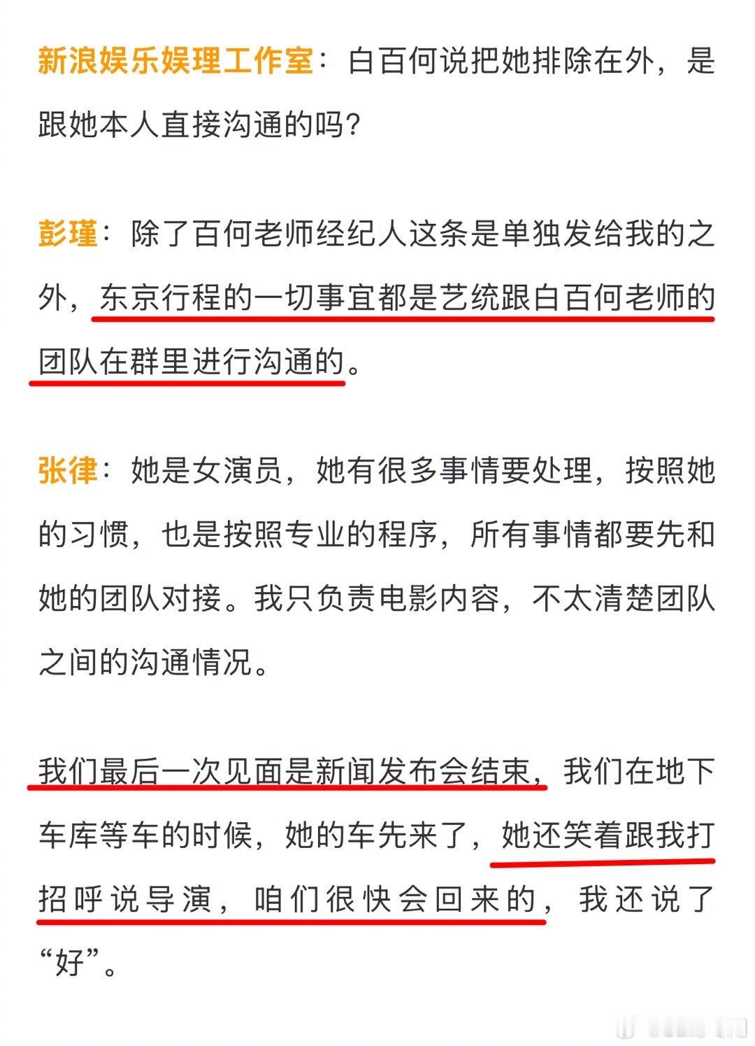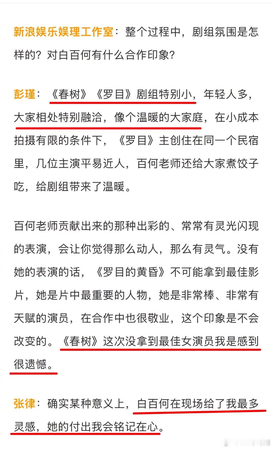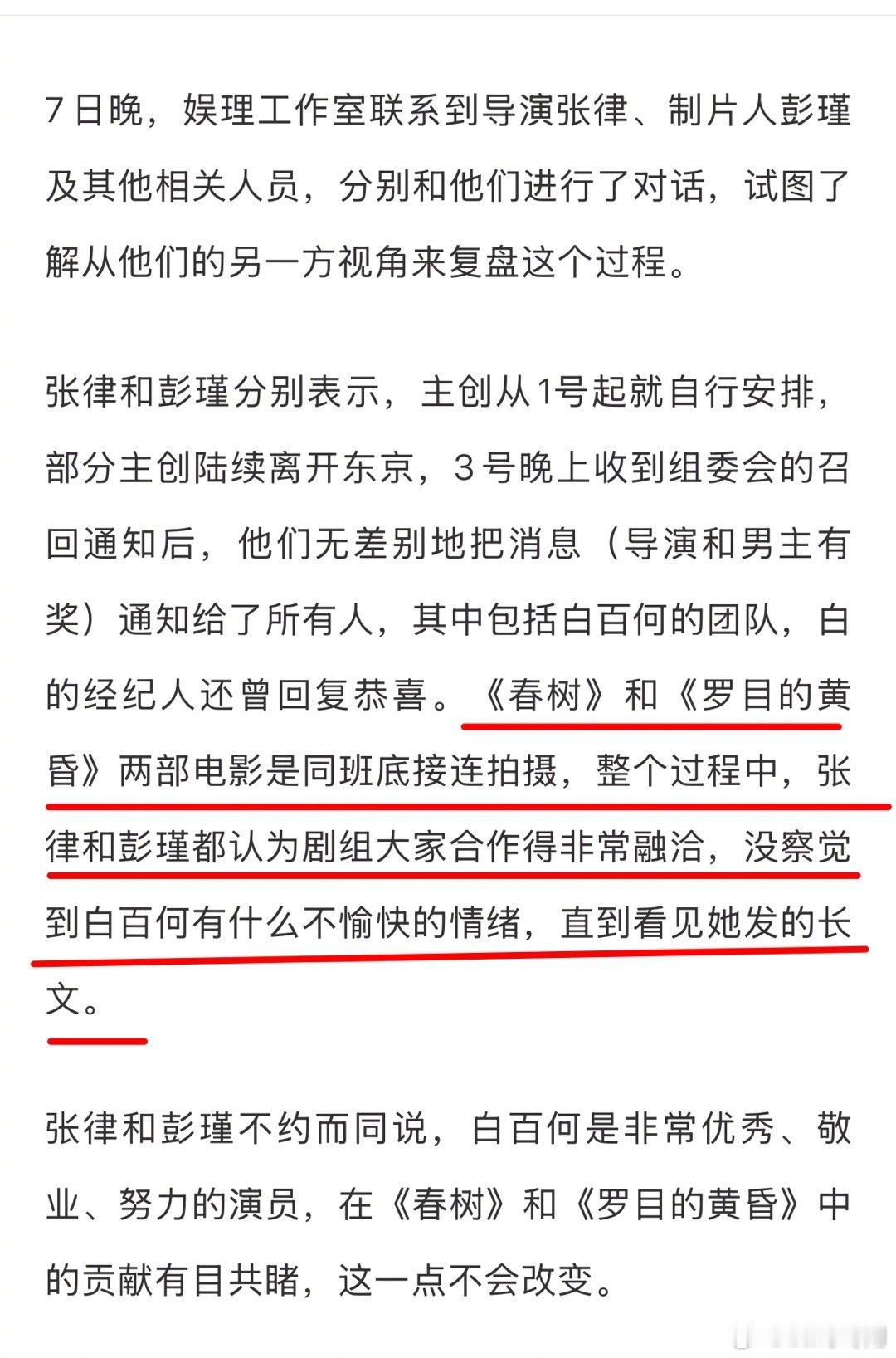 《春树》的导演张律、制片人彭瑾接受采访,回应白百何。他俩都表示,无差别的把导演和男主角获奖的消息通知给了所有人,白百何的经纪人还曾回复恭喜。他们觉得与白百何连续合作的两部电影都很愉快,未发现异常,直到看了长文。总的来说,他们说是沟通和看待问题不同,造成了误会。