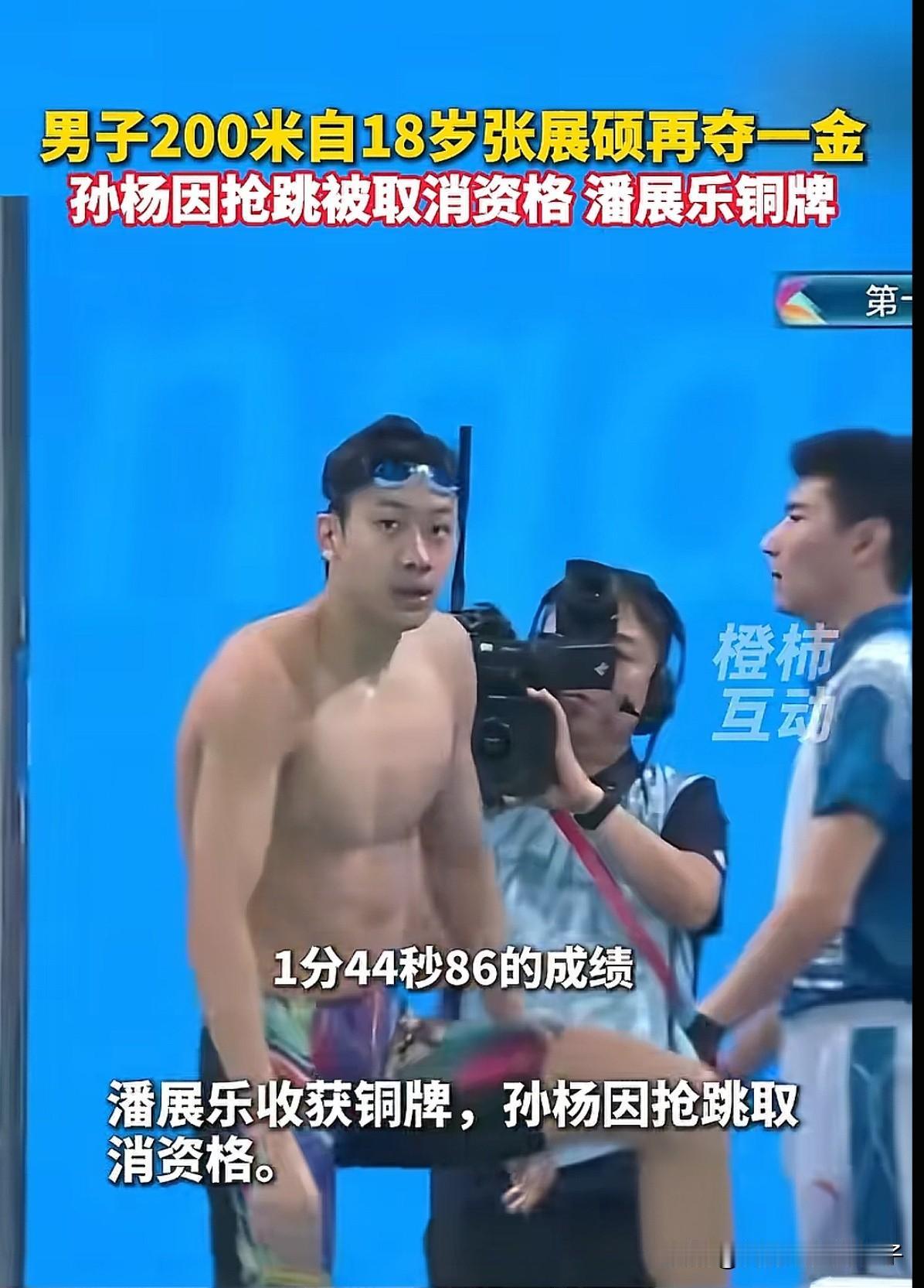 孙扬200米自由泳抢跳被取消资格! 毕竟他已经34岁老将了,能理解, 但是潘展乐成绩下滑这么严重,确实挺让人意外的,1分46秒37的成绩落后了张展硕快2秒,甚至比起他今年5月份全国游泳冠军赛1分45秒45秒也差了不少,状态太差了。 很多网友说,潘展乐从奥运下来后就没拿过好成绩,成绩挺一般的,是时候少参加那么多活动,该用心去训练了! 不过明天100米自由泳比赛,才是潘展乐最擅长的项目,预赛和半决赛都是第一晋级,还是很有希望夺冠的,希望他能拿下金牌,打破质疑!
