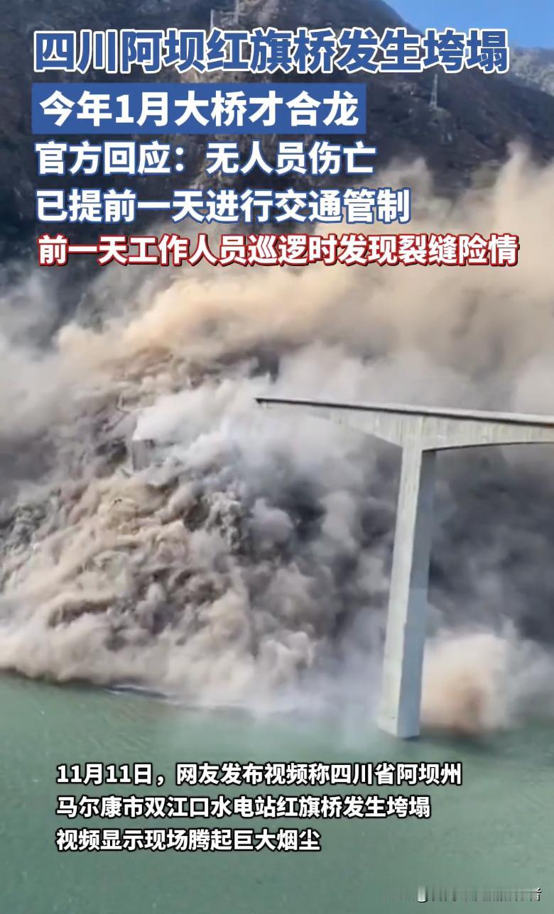 大自然的力量太震撼,也太意外了,还好四川阿坝红旗桥山体滑坡事件,没有造成人员伤亡。 四川阿坝红旗桥于今年1月刚建成,此次突发垮塌令人揪心。 万幸的是,当地政府及相关部门提前察觉隐患、及时实施交通管制,最终未造成人员伤亡与车辆损毁,这样迅速响应、果断处置的担当值得充分肯定与赞扬。 不过,大桥选址如何更精准地预判山体稳定性,从源头规避此类风险,仍需进一步深入研究与探讨。 大自然的破坏力太强大了,提前预警还是很有意义的,你说是不是让