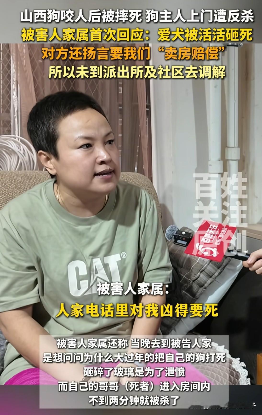 山西长治,狗咬人被摔死引发的血案! 狗主人家属首次回应了,受害者妹妹说对方太心狠了,明明她们家一s三伤才是受害者,但对方不仅没有道歉,现在还在网上引导舆论网暴她们! 那人明明是用板砖把狗砸s的,但是他在采访时却不提这事,说他只是被狗咬后出于愤怒,下意识踢了狗两脚,没想到男的还是宠物医生,居然这么狠心。 事后给他们家打电话说,把他的腿咬伤了,要让他们卖房卖地赔钱,语气特别的凶,他们觉得没有调解的余地了,所以才没有去调解。 当天晚上,她哥哥得知此事后,也是特别生气,就带着家人想去对方家里当面说清楚,没想到刚进去2分钟,就被他们家s害了,现在反倒他们成受害者了! 对此,您怎么看呢?