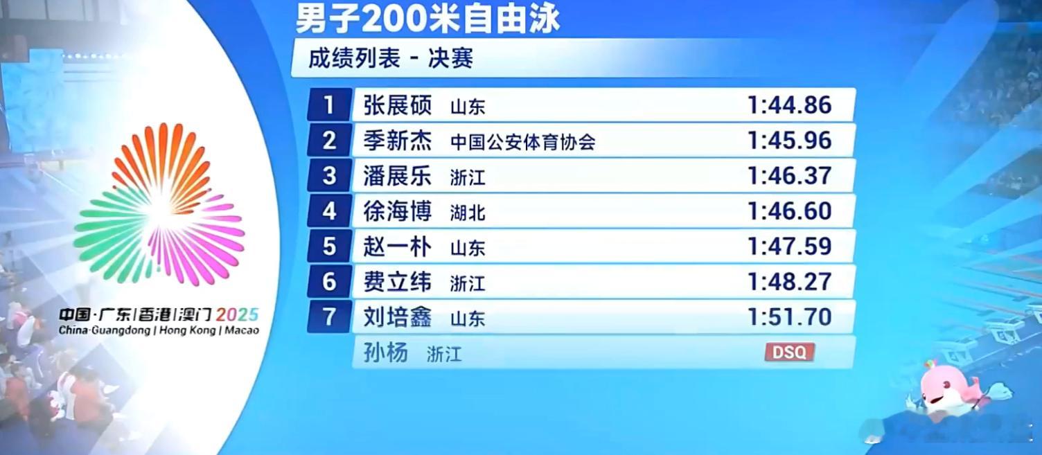 全运会男200自决赛张展硕夺冠再破纪录 潘展乐第三孙杨犯规无成绩11月12日晚,2025年全运会游泳大项开始第三决赛日较量,在首先进行的男子200米自由泳决赛里,山东选手张展硕以1分44秒86的优异成绩获得冠军,打破他自己保持的全国青年纪录。这个成绩和孙杨保持的1分44秒39的前亚洲纪录、现全国纪录差距不到半秒。预赛第一的张展硕第四道出发。前50米浙江选手潘展乐以24秒23领先,张展硕此时排名第三。半程张展硕和潘展乐同时游出51秒21,并列第一。100米到150米是潘展乐常规战术里要蓄力的阶段,他暂时退出前三,张展硕则一马当先,150米用时1分18秒15。最后50米开争,张展硕优势明显,已无悬念,山东老将、现效力于公安体协的季新杰紧紧追赶,潘展乐也重回前三!最终张展硕1分44秒86获得冠军,本次全运会已经拿下200自和400自双冠,季新杰1分45秒96获得亚军,潘展乐1分46秒37获得第三。单从名次上看,决赛第八道出场的孙杨获得第七,但因为出发明显抢跳而被判犯规。孙杨上岸后,向全场观众鞠躬致意。