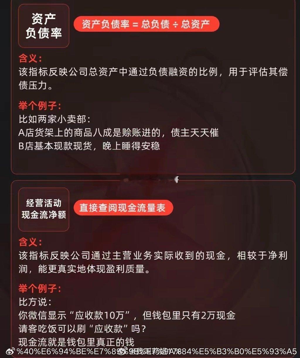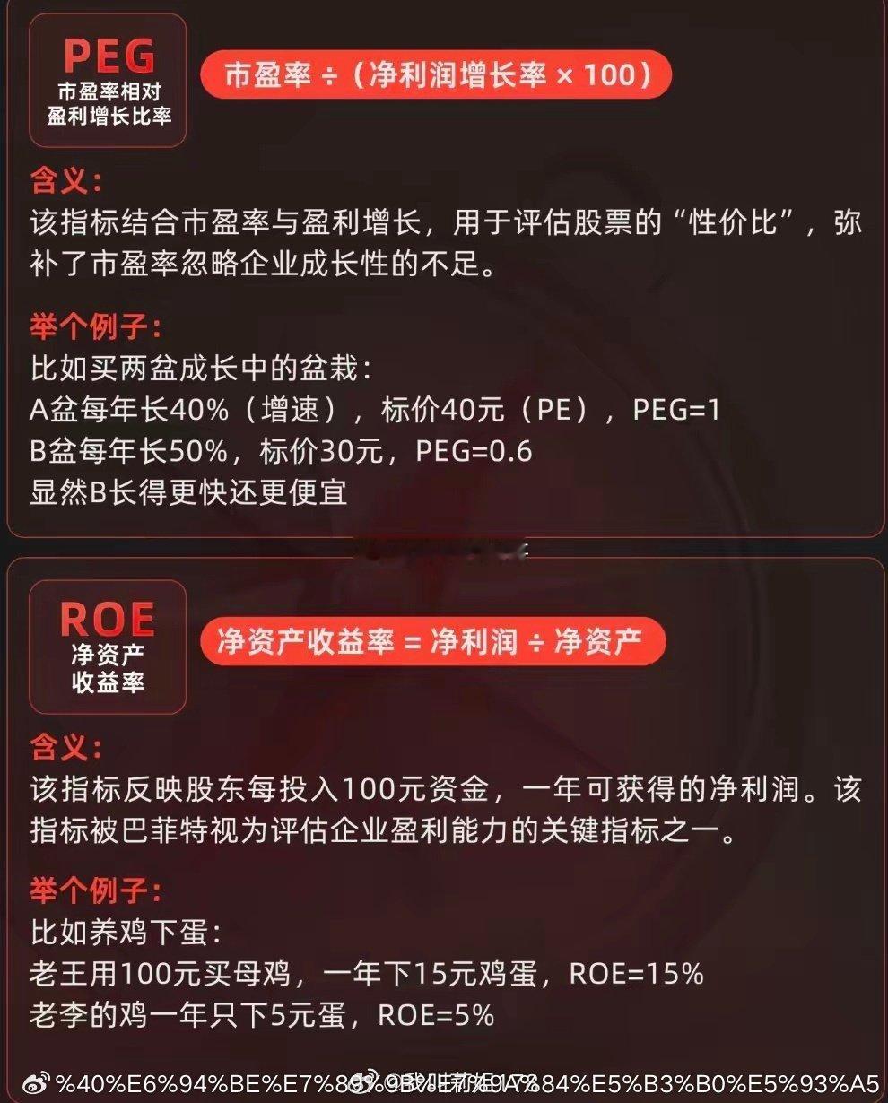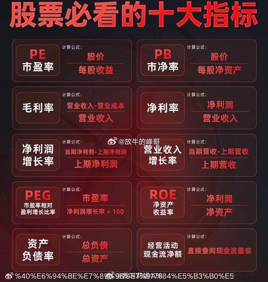 股票必看的十大指标❗️1.市盈率(PE)2.市净率(PB)3.毛利率4.净利率5.净利润增长率6.营业收入增长率7. 市盈率相对盈利增长比率(PEG)8. 净资产收益率(ROE)9.资产负债率10.经营活动现金流净额