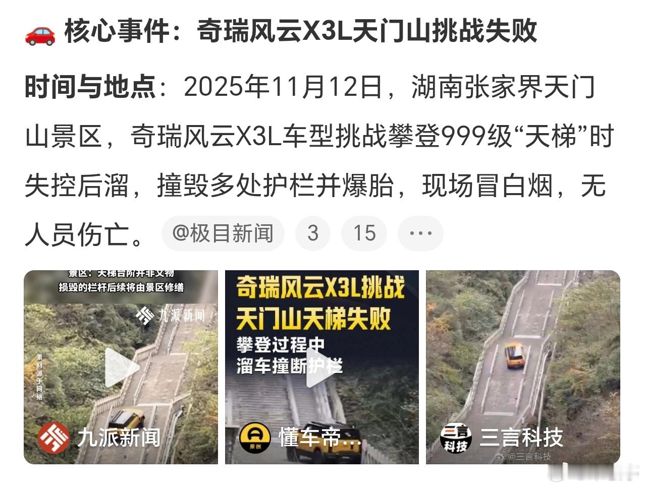 奇瑞风云这波挑战天门山天梯打滑撞坏护栏,确实挺尴尬的,这种测试对消费者实际用车体验有什么参考吗?