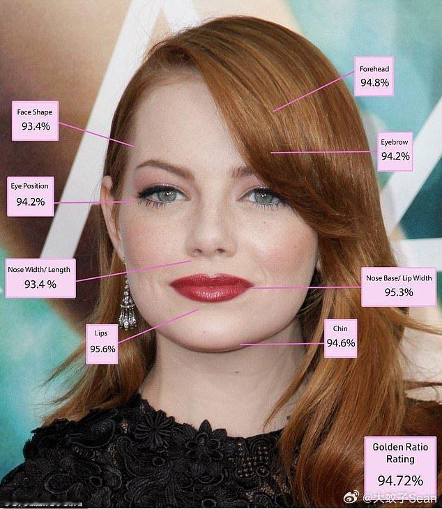 艾玛斯通被评选为“面部黄金比例美女”首位aka世界上最美的女人,据悉石头五官的黄金比例评分为94.72%,位列第一,榜单上的美女还包括Zendaya、凡妮莎柯比、娅娅、汤唯等,不过这是整容科医生Julian De Silva每几年就给当红明星做的面部黄金比例测算,主要还是搞点噱头为自己揽生意
