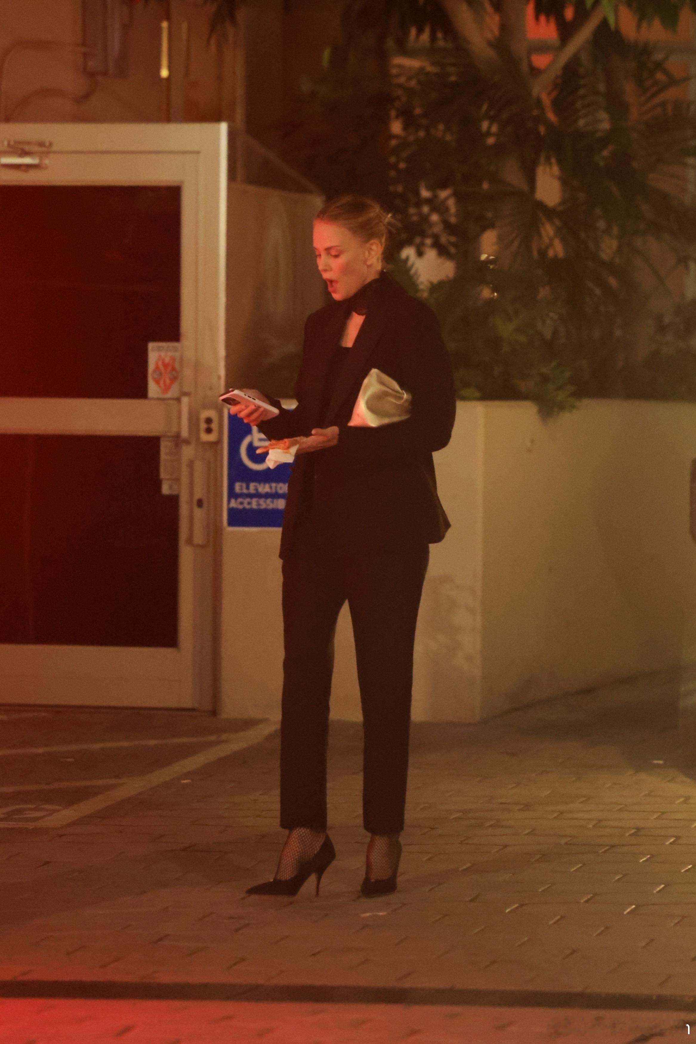 查理兹塞隆在西好莱坞外出离开Sunset Tower酒店,塞妈穿着一套黑色西装搭