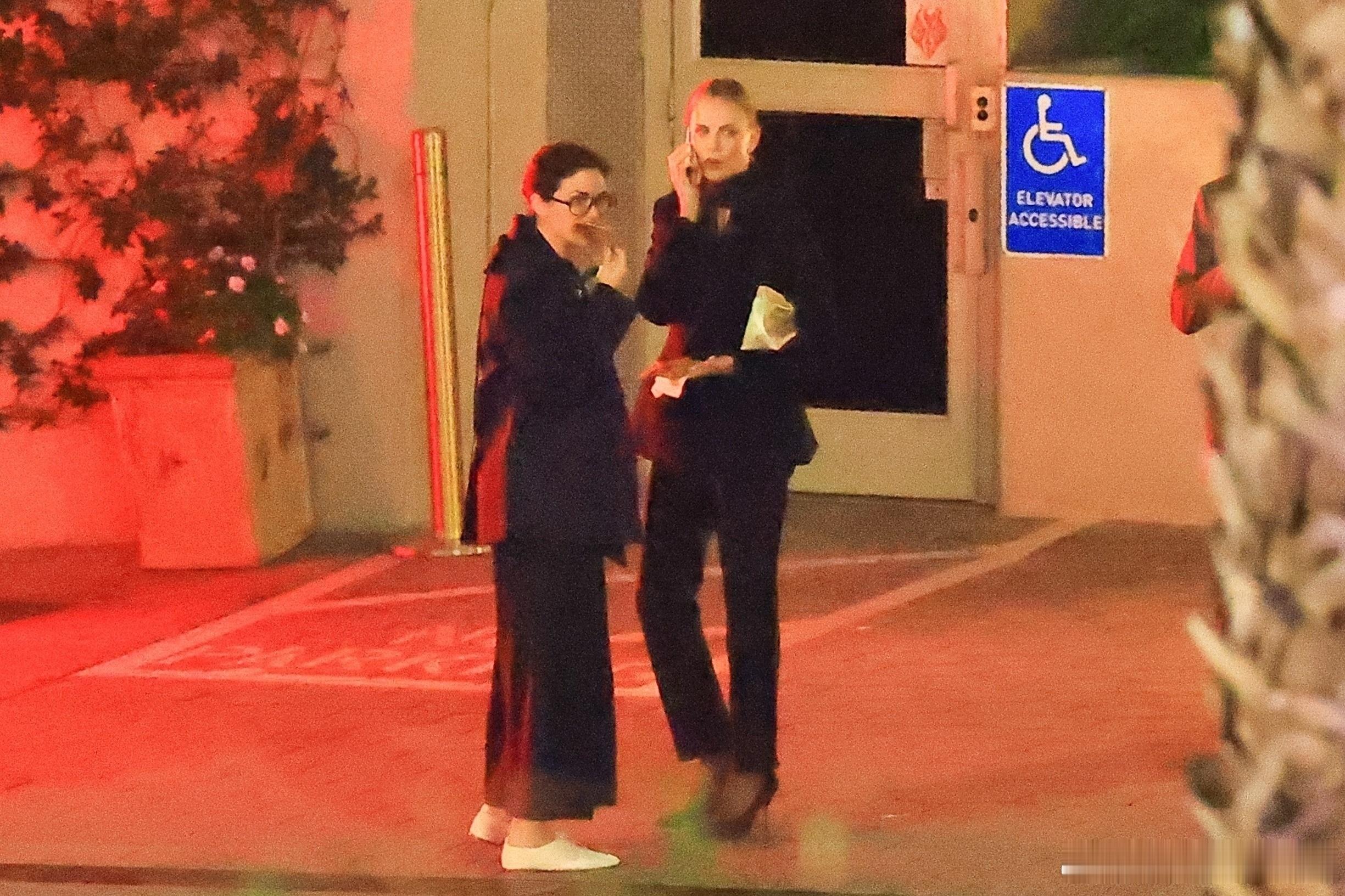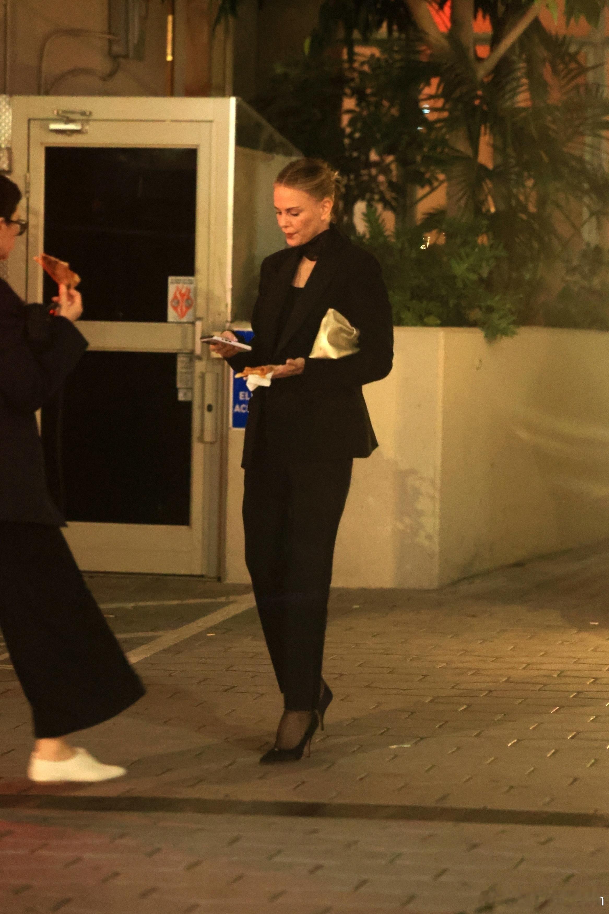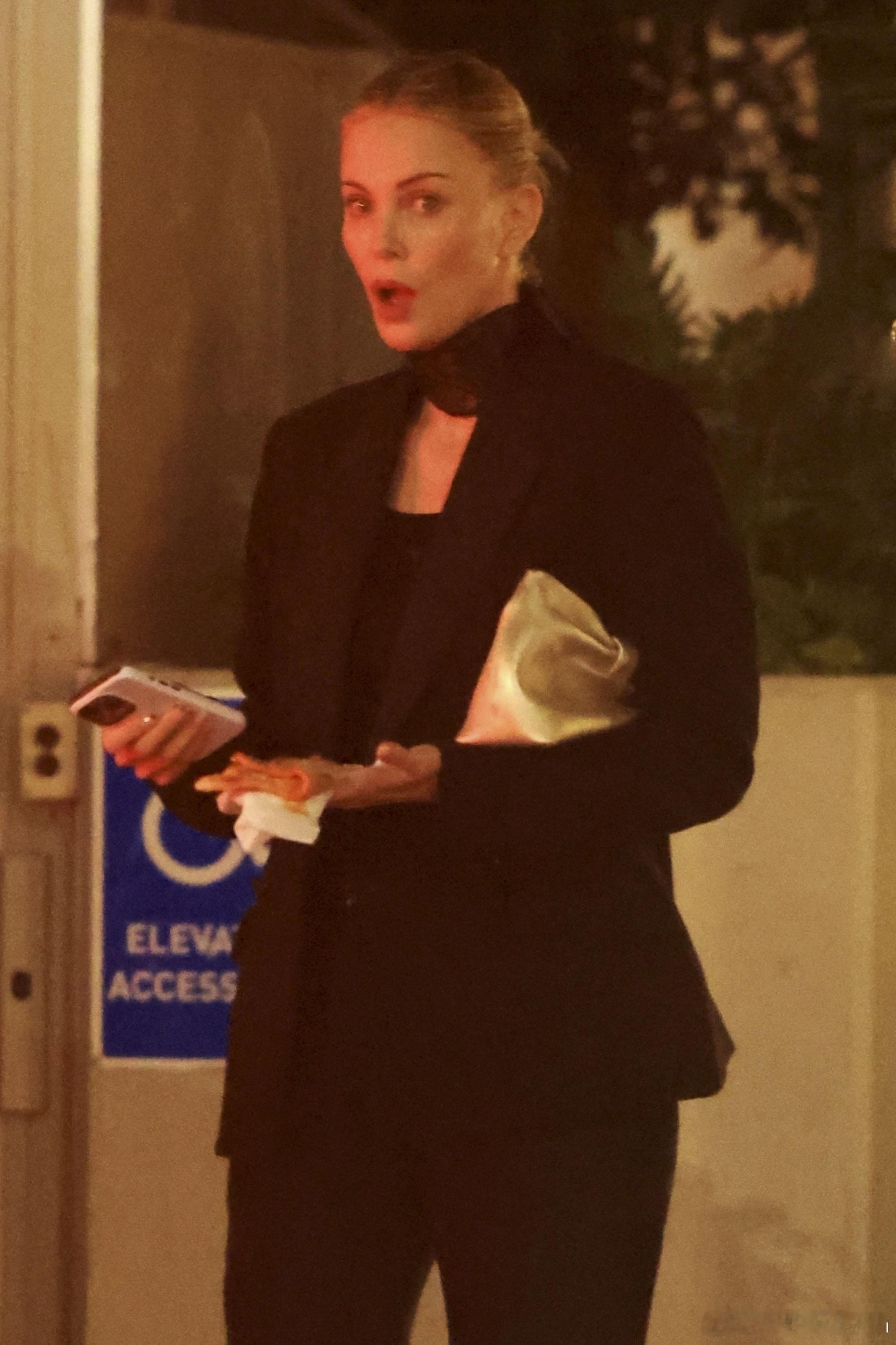 查理兹塞隆在西好莱坞外出离开Sunset Tower酒店,塞妈穿着一套黑色西装搭配细跟高跟鞋,手里还拿着一块披萨🍕