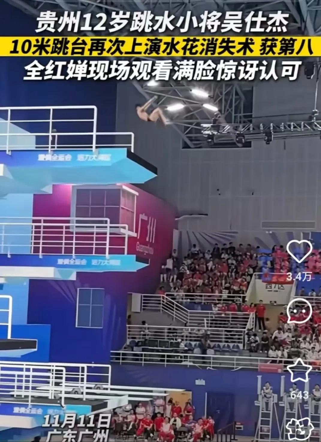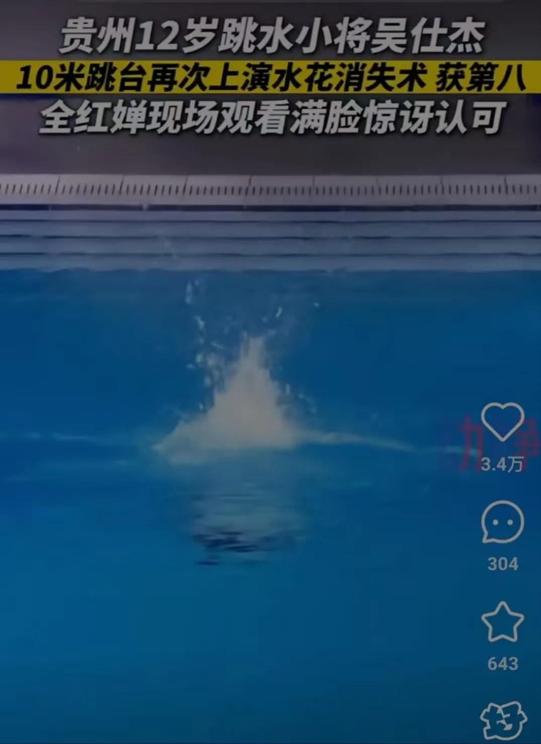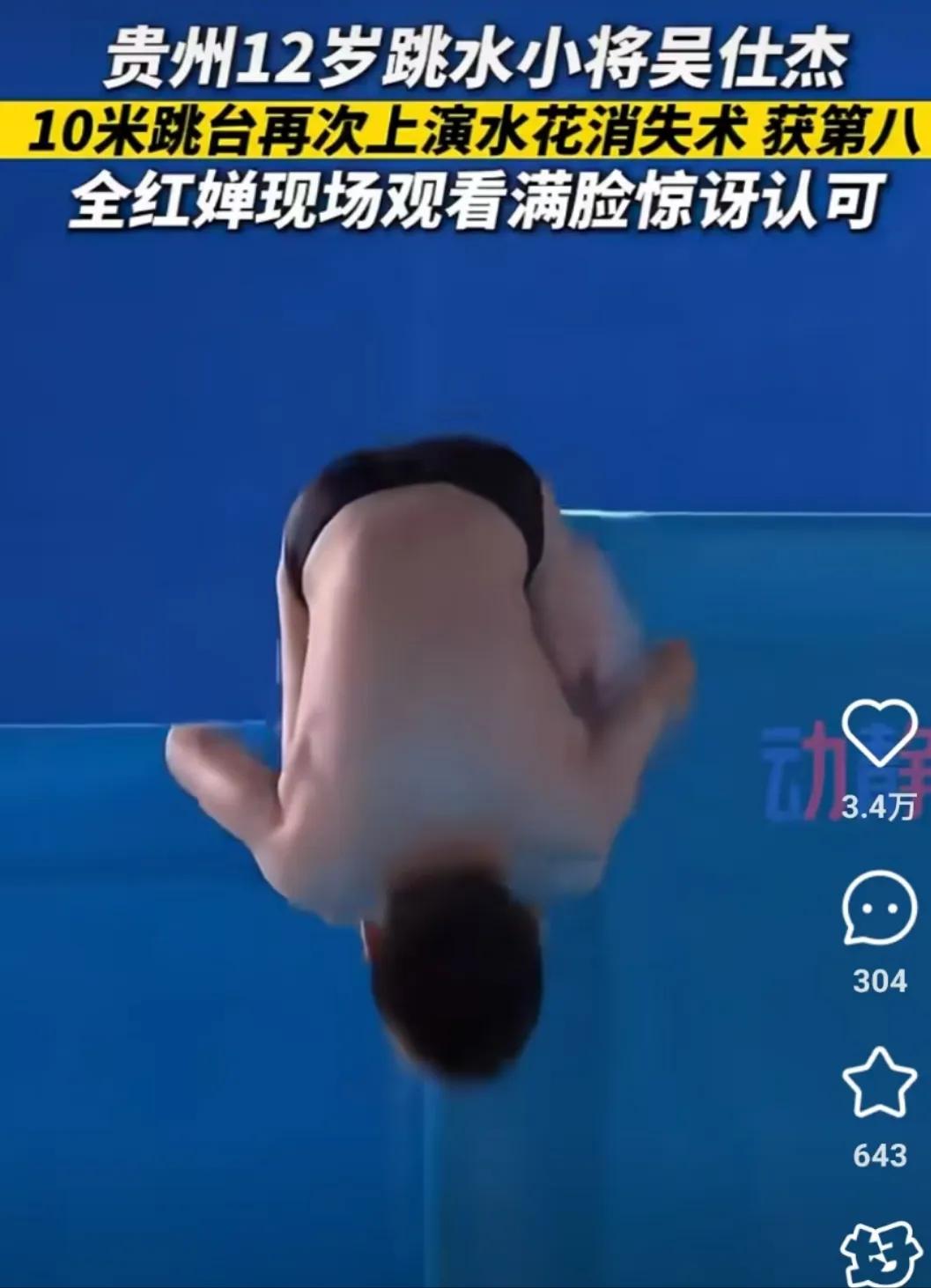 12岁小孩哥全运会上演水花消失术,下一个男版全红蝉 不得不说,12岁小孩哥的全运水花,真不是一句天赋好能说清的。 全运会首秀他站在高手堆里不慌不忙,第四轮一跳水花几乎没溅起来,动作流畅得像刻在水里的,现场记者都喊他是宝藏运动员。 9岁就拿全国跳水金牌,之后年年夺冠,今年资格赛还拿了银牌,哪块奖牌不是泡在池子里练出来的,哪次进步不是压着动作抠出来的。 都说全红婵是天才,可这小孩哥一步步从省队到全运,哪一步不是拼出来的?全运会跳水新星 小孩哥超神瞬间 水花消失之术