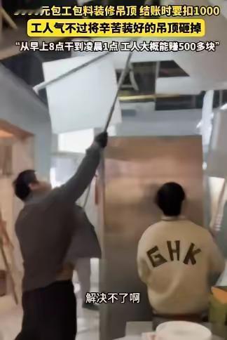 活久见!武汉这老板的操作简直刷新三观! 陈老板赶新店开业,找仨工人包工包料做吊顶,一口敲定3000块。人家从早8干到凌晨1点,饿肚子连轴转,电钻坏了跑两条街借,收尾还把现场扫得干干净净。 结果验收时,就几毫米的接缝,陈老板硬挑刺要扣1000!这活儿满打满算才赚500,扣完得倒贴,换谁能忍?工人气到直接砸了吊顶,陈老板报警也白搭,民警说口头约定也是合同,乱扣钱没道理。 为了1000块,开业推迟,房租和营业额亏得更多,这老板纯属自找的。做人做事得讲良心,欺负老实人、毁了规矩,最后只能坑自己!