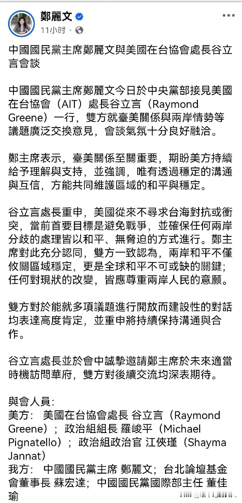 看看,国民党主席郑丽文与美国在台协会(AIT)处长谷立言3对3的会谈成果(图二),还行吧?感觉美国这位谷处长的讲话,也是四平八稳滴!