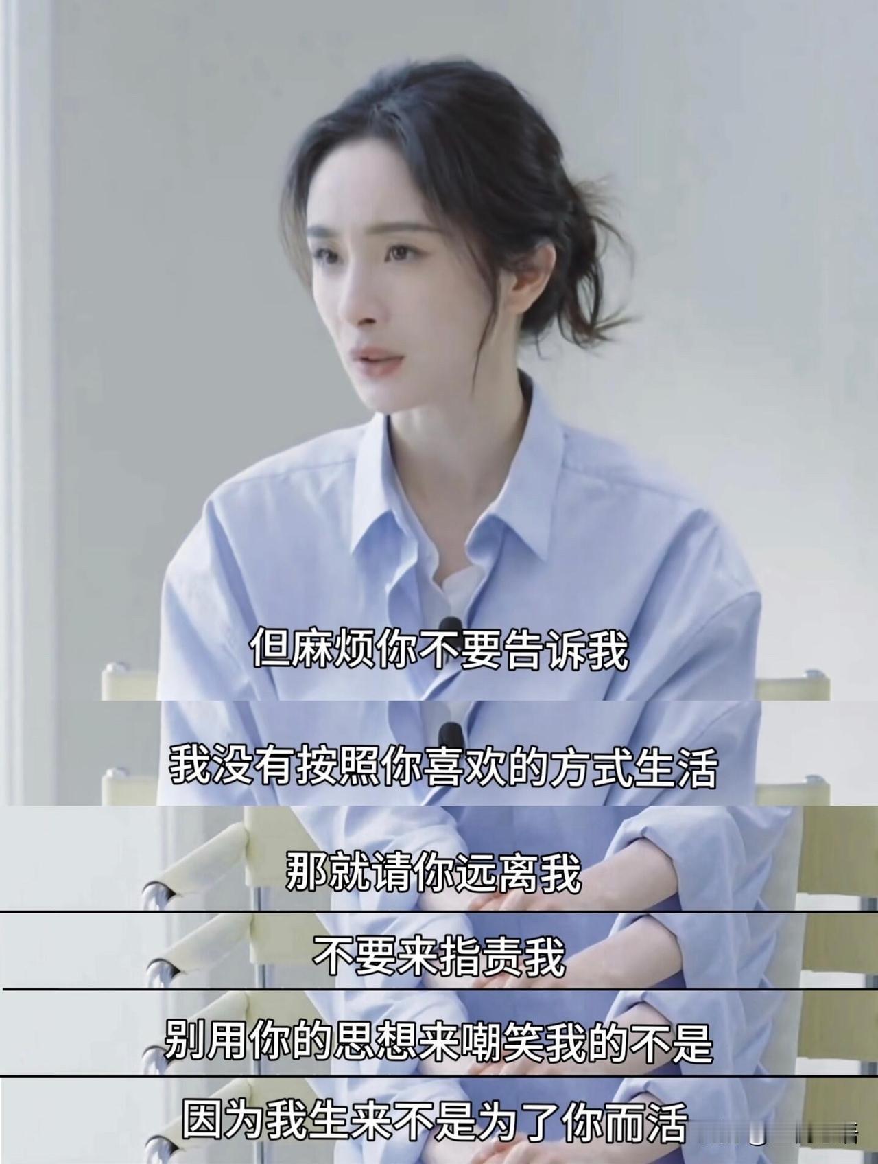杨幂这发言也太人间清醒了吧! 不喜欢你的性格、样子、说话方式? 没关系啊,不用特意告诉我。 我生来不是为你而活, 没必要按你的标准委屈自己。 这个世界是什么样,全看你怎么选。 心态好的人,把日子过成游乐场; 总纠结内耗的,才觉得处处是地狱。 别让某个人、某件事绊住脚步, 人得有随时翻篇的能力。 你盯着太阳走,自然甩得掉身后的阴影。 与其纠结别人喜不喜欢, 不如专心搞自己的事。 你优秀了,对的人自然会靠近。 别内耗啦,往前冲就对了! 杨幂