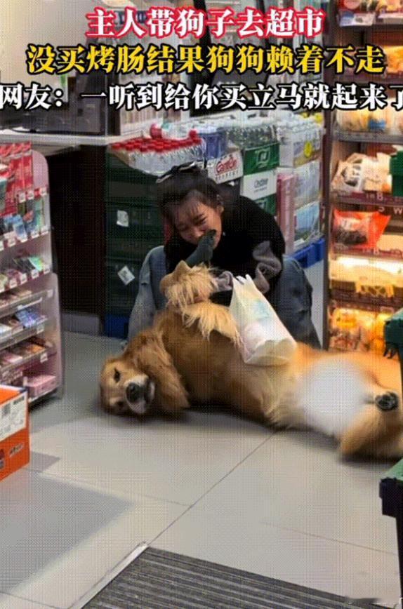 笑不活了!上海,女子带狗狗去超市,只因准备走的时候没给它买烤肠。结果狗狗直接躺地上赖着不走,不管主人如何拉它就是不起来。我发现现在的狗狗越来越有自己的想法了,并且情绪全写在了脸上。网友:一听到给你买立马就起来了。   2025年11月,上海的一位女士在外面遛狗之后,路过小区附近的便民超市时,想起家里牙膏快用完了,就牵着狗绳往店里走。   超市里,狗狗跟着主人的脚步慢慢逛,偶尔停下来嗅闻货架上的零食包装袋,尾巴轻轻扫过地面,看着很是乖巧。   女士很快选好东西结了账,准备走的时候,一直跟着的狗狗突然停住了脚步。   还没等女士反应过来,这只狗往后退了半步,紧接着前腿一弯,整个身子就瘫在了光滑的地砖上,任凭女士怎么扯动狗绳,它都牢牢钉在原地,脑袋还往旁边一歪,故意不看主人。   周围正在收拾东西的收银员和几位顾客都被这一幕吸引,纷纷看了过来。女   士脸上有点发烫,蹲下身试着去抱它,却发现这狗故意把身体坠得沉沉的,凭她的力气根本抱不动。   顺着金毛的视线一看,她这才明白过来,原来是没给它买烤肠,在这儿闹脾气呢。   旁边有热心的顾客劝她,既然小家伙这么执着,不如就买一根算了。   女士摇了摇头,她看着狗狗圆滚滚的肚子,知道平时零食没少给,何况现在快到睡觉时间,吃油腻的烤肠确实不好。   她试着站起身往门外走了两步,想让狗狗知道耍脾气没用,可回头一看,那狗正眯着眼睛偷偷瞟她,见她没真走,干脆把爪子往脸上一搭,摆出一副“耗到底”的模样。   就这样耗了大概五六分钟,女士实在没了办法,她走回狗狗身边,蹲下来抚摸它的背,无奈地说了句给你买好吧。   没想到话音刚落,原本赖在地上的狗狗立刻支棱起身子,尾巴欢快地摇了起来,刚才那股子倔强劲儿消失得无影无踪。   这前后反差极大的一幕,被旁边一位顾客拍了下来传到网上。   视频下面的评论区里,喜欢这只狗狗的网友占了大多数。   有人说自己家的宠物也会用类似的方式表达需求,这种通人性的表现特别治愈。   还有人重点提了狗狗偷偷观察主人的细节,觉得那个小眼神简直把“拿捏主人”写在了脸上,可爱到让人不忍心责怪。   不少养宠人士还分享了自家宠物的“小伎俩”,评论区一度变成了晒宠交流会。   反对的声音也很直接,一些网友觉得这种行为不能纵容。   他们认为宠物的行为边界需要主人来划定,每次耍无赖就妥协,只会让它觉得这种方式有效,以后只会变本加厉。   还有人说,现在很多养宠人把宠物当成孩子溺爱,却忽略了宠物需要明确的规则约束,这种看似疼爱的做法,其实是在助长坏习惯。   无论争议如何,不可否认的是,这种细节中藏着主宠之间深厚的感情。   狗狗敢这样在主人面前放下防备耍脾气,是因为它清楚主人对自己的包容,主人嘴上说着要管教,最后还是心软妥协,也是因为朝夕相处的陪伴早已让这只狗狗成了家庭的一份子。   这种相互依赖的情谊,正是很多人养宠的意义所在。   真正健康的主宠关系,应该是既有彼此包容的温情,也有明确的行为边界,这样既能保留宠物的灵性可爱,也能让这份陪伴更长久稳定。
