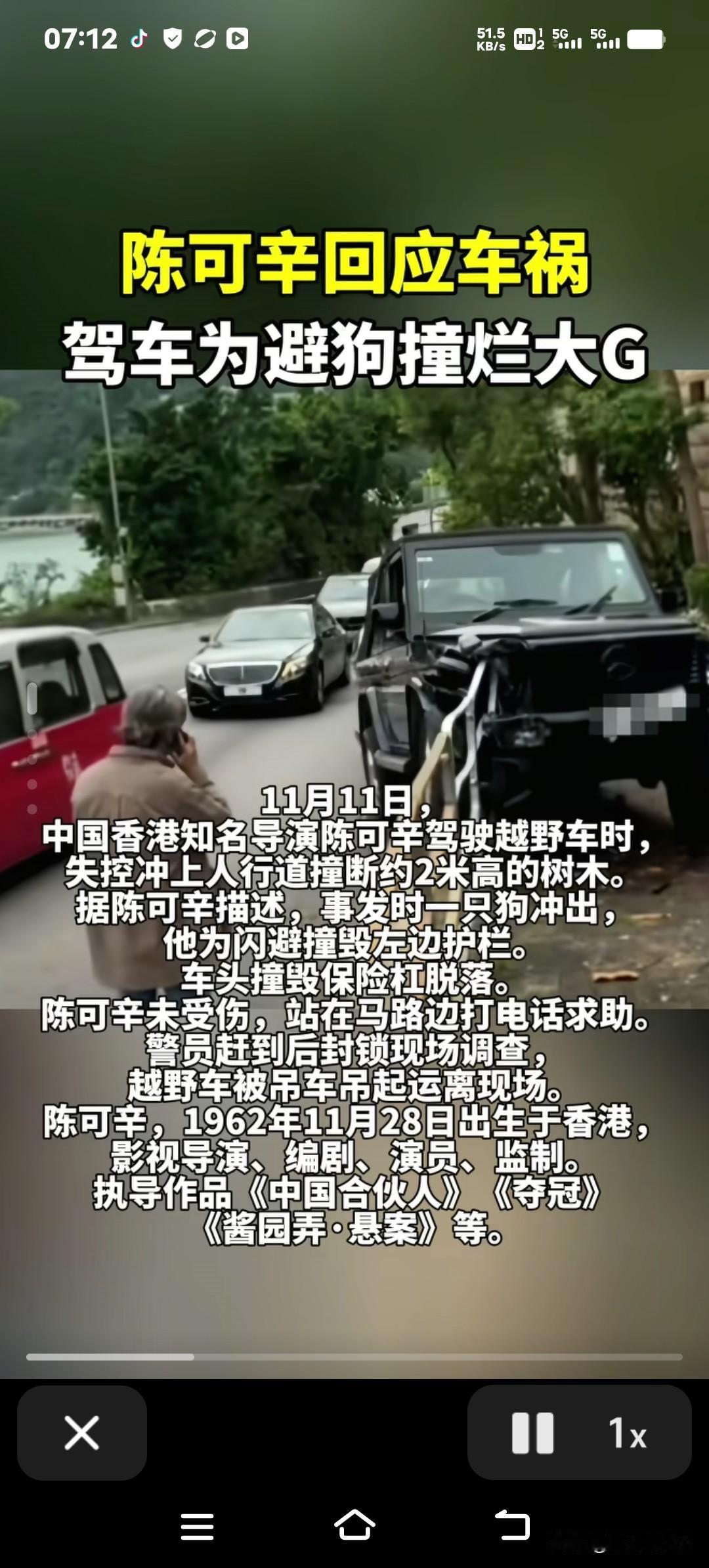 著名导演陈可辛开车撞树,居然是为了躲这个?网友:这理由有点离谱 一条突然窜出来的小狗,直接让陈可辛上演了一出“现实版车祸大片”!他为了躲这条狗,把路边的行道树都撞断了,奔驰车的前车头都撞得变形了,这情节比他拍的电影还惊险刺激~ 11月11号中午,陈可辛开着他的奔驰越野车在深水湾香岛道上行驶,突然一条小狗猛地从马路边冲了出来。为了躲开这条“不速之客”,陈导赶紧猛打方向盘,结果车失控了,不仅撞坏了路边的栏杆,还冲上人行道撞断了一棵行道树。现场拍的照片能看到,奔驰车的右前灯都彻底坏了,好在陈可辛自己一点伤都没有。 事故发生后,陈可辛先下车联系了救援,之后就离开了现场,留下女助手在那里处理后续的事情。现在出事的车已经被拖走了,警方正在调查具体是什么情况导致的。 网友们都在讨论:这狗是来试镜的吗?陈导下一部电影要不要拍个《忠犬八公2》啊?不过说真的,开车遇到这种突然冒出来的情况,你会怎么选?