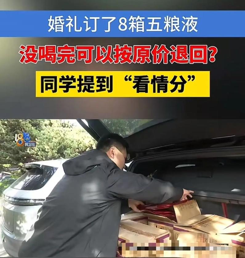 浙江杭州,男子结婚找老同学订了8箱五粮液,说好没喝完可以按原价退回。但是他把喝剩
