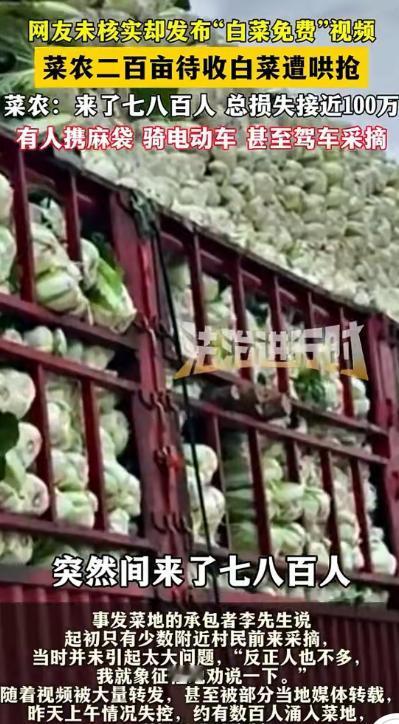 “这是什么世道!”内蒙古赤峰,男子承包了200亩地种大白菜,辛苦了一年,眼瞅着要卖钱了,万万没想到,突然来了700多人,拿着麻袋,骑着电动车,甚至开车来哄抢,男子损失高达100万,一年白辛苦了。背后的原因,竟是有人使坏,在网上发布“白菜免费”的视频,当地媒体未经证实也开始转发,男子崩溃。 10月底的赤峰,气温已经降到零下。50岁的李先生裹着厚重的棉袄,蹲在自家白菜地边,手里攥着一颗被踩烂的白菜,指节都泛了白。 眼前的地里,到处是散落的菜叶、被踩断的菜根,还有村民遗留的塑料筐。一周前,这里还是一片绿油油的景象,200亩大白菜长得饱满结实,每一颗都足有五六斤重。 “我从开春就开始忙,翻地、育苗、浇水、施肥,雇了十几个工人,投进去80多万成本。”李先生声音沙哑,眼角的皱纹里还沾着泥土,“就等着这几天收割卖钱,给工人发工资,给家里还贷款。” 10月25号早上,他像往常一样去地里查看,远远就看见十几个村民正在拔白菜,手里还拿着编织袋。“住手!这是我家的菜,不是免费的!”李先生一边喊一边跑过去。 可村民们根本不听,有人还扬了扬手机:“网上都发了,说老板跑路了,白菜免费送,地址都标得清清楚楚!”李先生急得浑身发抖,掏出手机想解释,却发现地里的人越来越多。 从早上到下午,陆续来了几百人,三轮车载着满满当当的白菜往村里拉。李先生拦这个、劝那个,最后被一个扛白菜的壮汉推倒在地,后腰撞到了石头上,疼得站不起来。他看着自家的白菜被一抢而空,当场就哭了。 两天后,地里一颗完整的白菜都没剩下。这场哄抢,让他一年的辛苦全打了水漂。是谁造的谣,能有这么大的破坏力? 警方接到李先生的报警后,很快就查到了谣言的源头。 发布者是当地一个开小超市的男子张某,平时就喜欢拍些短视频发网上博关注。10月24号下午,他路过李先生的白菜地,看到地里的白菜长得好,就拍了段视频。 为了让视频有热度,他随口编了句文案:“赤峰某菜农老板跑路,200亩大白菜免费送,要的赶紧来!”还在视频里隐约拍了下路边的路牌,暗示了大概位置。 张某自己都没想到,这条随口编造的视频,会被当地一家颇有影响力的官方媒体转发。更要命的是,这家媒体转发时,不仅没核实信息,还直接标注了详细的地址和导航路线。 “官方媒体都发了,肯定是真的!”原本只有少数人看到的谣言,经官方媒体背书后,瞬间在当地微信群、朋友圈炸开了锅。有人甚至在村里大喇叭吆喝,召集村民去“领”白菜。 张某后来接受调查时,吓得脸都白了:“我就是想涨几个粉,没想到会闹这么大,更没想到媒体会转发……”可此时,再多的后悔也换不回李先生的白菜。 在这场哄抢事件中,最让人气愤的,就是那家官方媒体的失责行为。 做新闻的都知道,“核实”是底线。可这家媒体转发张某的虚假视频时,连最基本的电话核实都没做。他们不仅配了“免费白菜,先到先得”的煽动性标题,还特意标注了“导航至XX村路口即可到达”,相当于给哄抢者画了张精准的“作案地图”。 有村民说,一开始大家还半信半疑,觉得“天下哪有免费的午餐”。可看到是官方媒体发的,就彻底放下了戒心。“人家是官方的,总不能骗人吧?” 正是这份“公信力”,让原本零星的试探,升级成了大规模的哄抢。李先生找到这家媒体讨说法时,对方一开始还辩解“是为了给市民谋福利”,直到警方介入,才删了视频,却迟迟不公开道歉。 媒体的公信力,是无数记者用事实和专业积累起来的。可这家媒体的一个草率举动,就把公信力当成了流量的“垫脚石”,也成了摧毁一个农户生计的“帮凶”。这样的行为,能被原谅吗? 李先生在地里反复哭喊“这是我家的菜,要花钱买”,甚至拿出了土地承包合同和缴费凭证。可大多数哄抢者根本不管,有人说“这么多菜,少几颗不算啥”,有人说“媒体都发了是免费的,你别小气”,还有人趁乱推搡李先生,说他“想讹人”。 有个老太太抱着两颗白菜路过,李先生拦住她解释。老太太翻了个白眼:“大家都在拿,我拿两颗怎么了?你一个老板还缺这点钱?”说完抱着白菜就走,生怕被追上。 更让人寒心的是,有几个村民甚至开着拖拉机来,一次性拉走了几十颗白菜,还说“要腌酸菜,够吃一冬天”。他们根本没想过,这些白菜是李先生一家的生计,是十几个工人的工资来源。 目前,警方已经对事件展开全面调查,相关责任人都将承担相应的法律责任。 造谣者张某,因涉嫌编造、故意传播虚假信息,被处以行政拘留10日,并处500元罚款。警方还在逐一排查哄抢者,已经找到20多名积极参与者,他们需要赔偿李先生的损失,情节严重的还会被拘留。 而那家失责的官方媒体,也被上级主管部门约谈。目前,媒体已经公开向李先生道歉,并承诺赔偿部分经济损失。但网友们并不买账,认为“道歉不够,还应该追究相关编辑、审核人员的责任”。