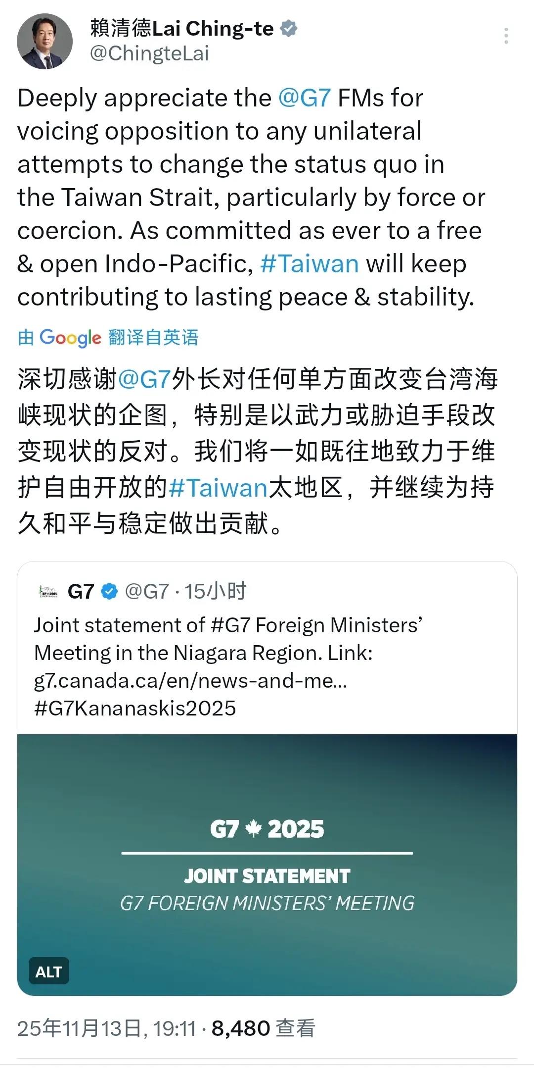 真是开眼了!11月13日晚这出“台独”抱大腿的戏码,看得我血压都上来了! 赖清德那篇“深切感谢”的发文,活脱脱像个找着靠山的小跟班,字里行间全是谄媚劲儿,真是醉了! 他转发G7联合声明,一口一个“反对单方面改变现状”,我就纳闷了—— 台湾是中国的一部分,这是铁打的事实,哪儿来的“现状”需要外人指手画脚? 说白了,这就是“台独”分子和外部势力唱的双簧!G7揣着干涉别国内政的小心思,赖清德抱着“倚外谋独”的幻想,俩臭皮匠凑一块儿,以为能搅乱台海? 太天真了! G7口口声声说“维护和平稳定”,纯属睁着眼睛说瞎话!历史上哪回外部势力插手他国内政,不是把地方搅得鸡犬不宁? 他们所谓的“反对武力胁迫”,不过是给“台独”分子递刀子,破坏台海和平的祸根,就是这帮人! 我觉得吧,赖清德怕是忘了,台湾民众要的是和平发展,不是跟着他搞分裂、当棋子! 两岸同胞血浓于水,统一是刻在骨子里的共识,是历史大势,谁也拦不住! 再说了,中国的内政,轮得到G7来指手画脚?这就跟邻居家的事儿,你一个外人冲进来指东骂西,不是找抽是什么? 国际法和国际关系基本准则摆那儿呢,干涉他国内政就是违规操作,迟早被反噬! “台独”分子以为抱上G7的大腿就能高枕无忧,殊不知这大腿根本不靠谱! 当年那些被外部势力忽悠的角色,最后哪个有好下场?不过是人家手里的棋子,没用了就一脚踢开! 赖清德这声“感谢”,哪里是什么外交操作,分明是“台独”分裂行径的又一丑陋注脚,丢人现眼! 说实话,这波操作除了让两岸同胞更看清“台独”的真面目,啥用没有! 统一大势浩浩荡荡,顺之者昌,逆之者亡!“台独”分子再怎么蹦跶,再怎么抱外人大腿,也改变不了最终的结局! 等着吧,迟早被钉在历史的耻辱柱上,遭全中华民族的唾弃!