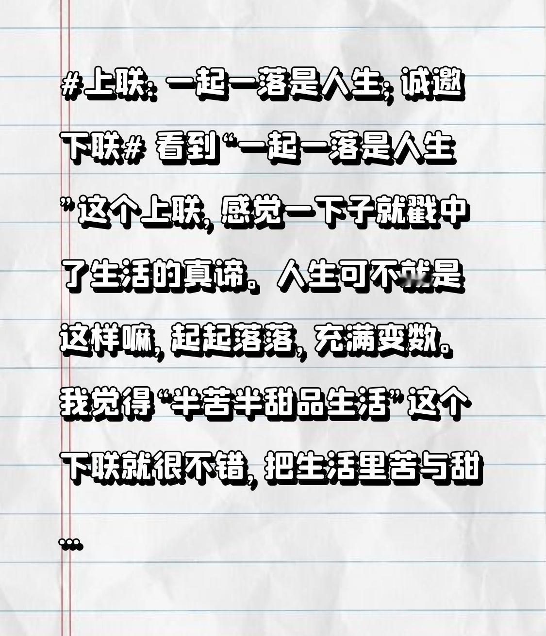 看到“一起一落是人生”这个上联,感觉一下子就戳中了生活的真谛。人生可不就是这样嘛,起起落落,充满变数。我觉得“半苦半甜品生活”这个下联就很不错,把生活里苦与甜交织的滋味描绘出来了。 还有“悠然自得是心境”也挺好,在人生的起伏中保持悠然的心境,这是种难得的境界。“云卷云舒是自然”也很妙,将人生的起伏和自