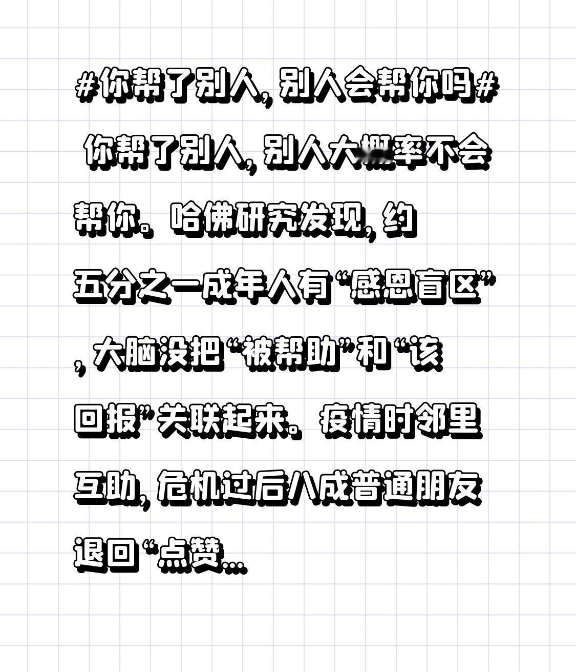 你帮了别人,别人大概率不会帮你。哈佛研究发现,约五分之一成年人有“感恩盲区”,大脑没把“被帮助”和“该回报”关联起来。疫情时邻里互助,危机过后八成普通朋友退回“点赞之交”。 Z世代中73%的人发电子感谢卡,动手帮忙的却仅三成,把感恩当“社交表情包”。不过职场里00后不一样,你花两小时教他写周报,他能记三年。人性复杂,帮人时别期望太高,不然落难时等来的可能不是援手,而是冷漠。