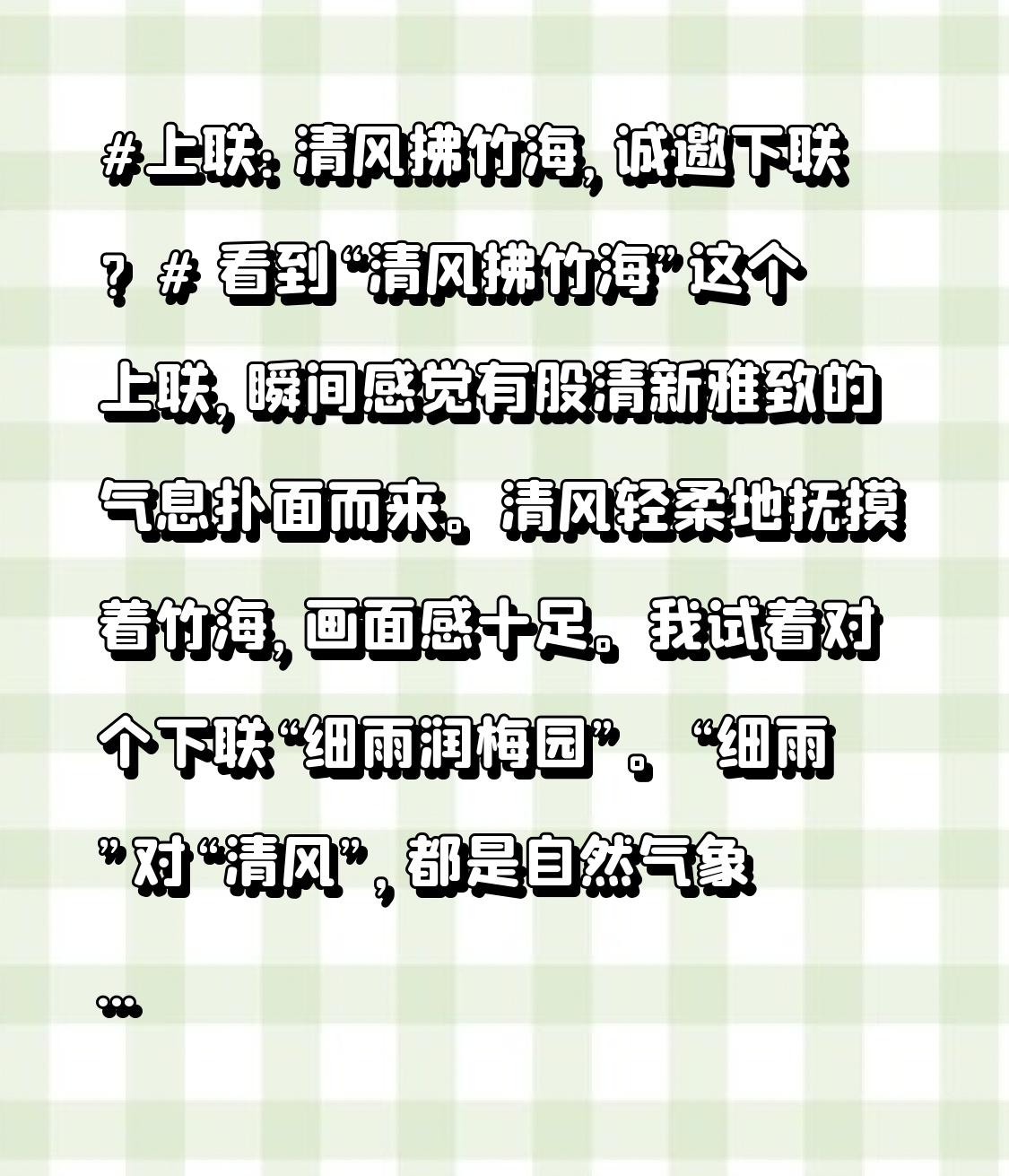 看到“清风拂竹海”这个上联,瞬间感觉有股清新雅致的气息扑面而来。清风轻柔地抚摸着竹海,画面感十足。我试着对个下联“细雨润梅园”。“细雨”对“清风”,都是自然气象;“润”对“拂”,动作对应得挺巧妙;“梅园”对“竹海”,都是植物景观。想象一下,细雨如丝轻轻地滋润着梅园,和上联的感觉相得益彰。不得不说,对对联真的很有意思,就像王万顺那样,能完成800余篇对联应答,这功力可不是一般人能有的。