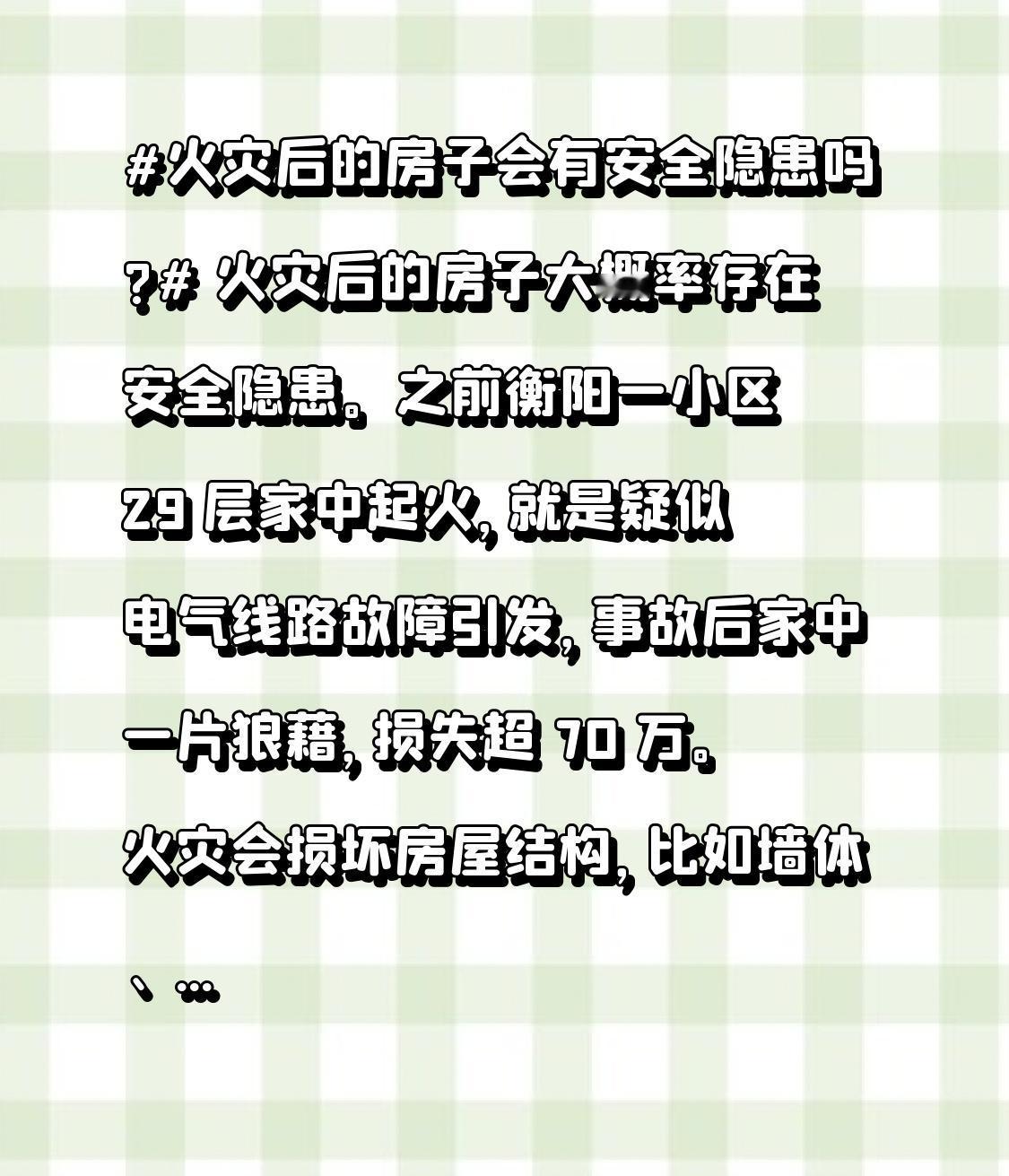 火灾后的房子会有安全隐患吗? 火灾后的房子大概率存在安全隐患。之前衡阳一小区 29 层家中起火,就是疑似电气线路故障引发,事故后家中一片狼藉,损失超 70 万。火灾会损坏房屋结构,比如墙体、梁柱等可能因高温出现裂缝、变形,影响稳定性。其还会破坏电气线路、管道等设施,留下漏电、漏水等隐患。 从价值层面看,火灾会让房子贬值。依据相关法规,房屋因火灾影响居住安全性和舒适度,市场价值降低。若不及时修复,贬值和安全隐患会更严重。所以火灾后的房子,一定要全面检测和修复,确保安全。