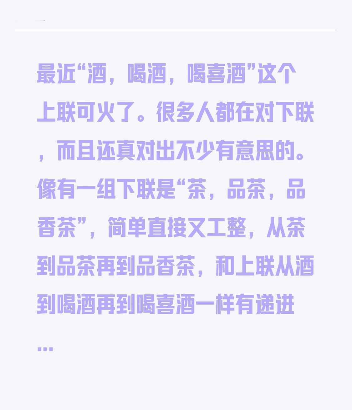 最近“酒,喝酒,喝喜酒”这个上联可火了。很多人都在对下联,而且还真对出不少有意思的。像有一组下联是“茶,品茶,品香茶”,简单直接又工整,从茶到品茶再到品香茶,和上联从酒到喝酒再到喝喜酒一样有递进感。还有“书,读书,读奇书”也不错,展现出一种求知的递进。我觉得对下联挺考验功力的,既要讲究对仗,又得有递进层次,还得有韵味。这小小的对联里,藏着咱们中华文化的大智慧呢。