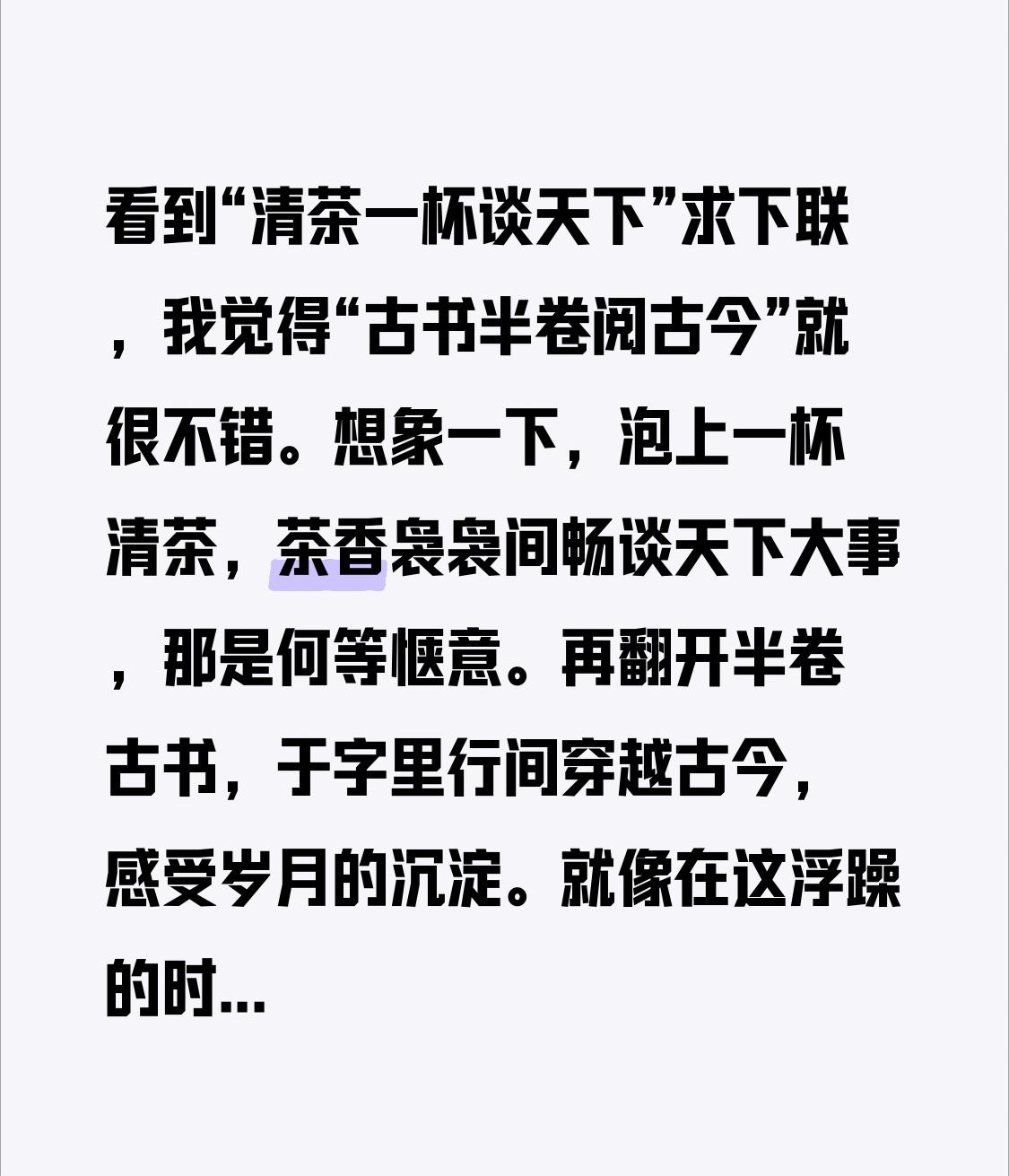 看到“清茶一杯谈天下”求下联,我觉得“古书半卷阅古今”就很不错。想象一下,泡上一杯清茶,茶香袅袅间畅谈天下大事,那是何等惬意。再翻开半卷古书,于字里行间穿越古今,感受岁月的沉淀。 就像在这浮躁的时代,清茶能涤去内心的尘埃,古书能滋养我们的精神。当茶香与墨香交织,仿佛能看到古往今来的文人墨客在时光中对坐,共话人生。要是让我再想一个,“浊酒三盏论古今”也挺合适,大家觉得呢?