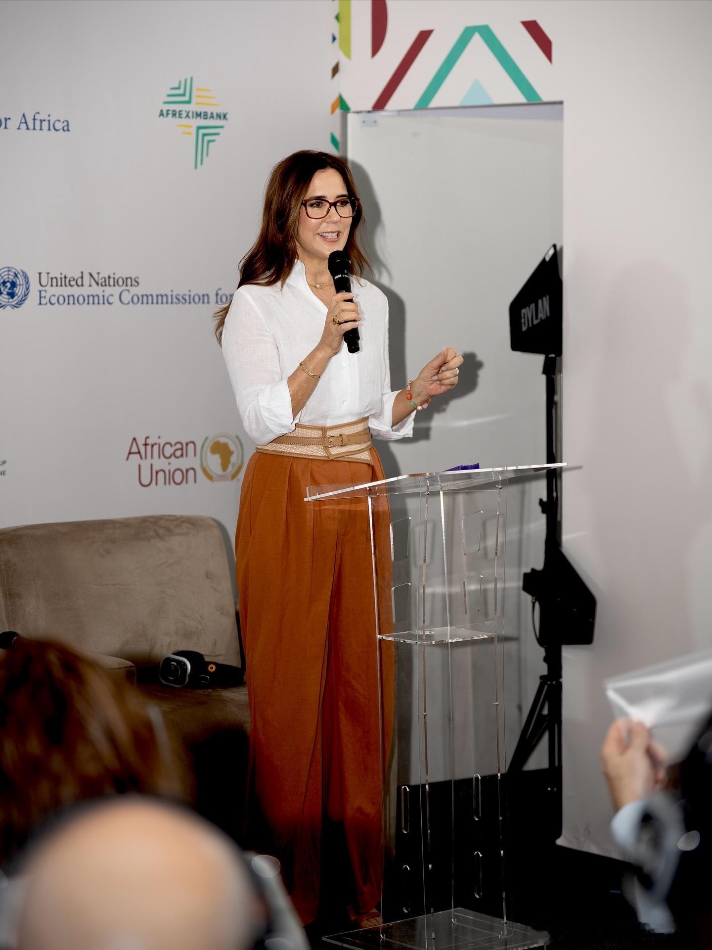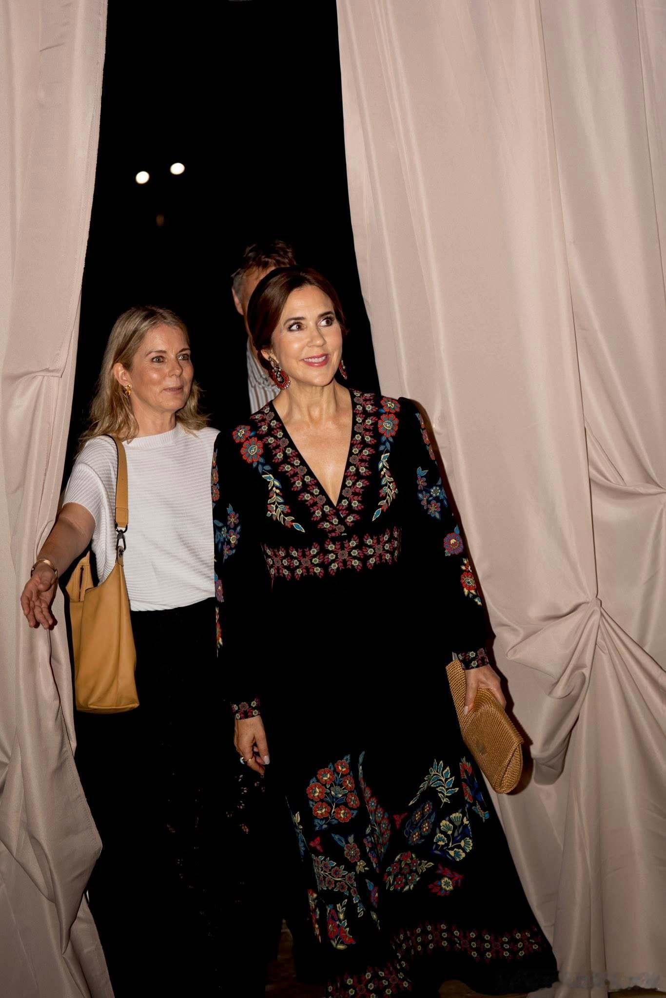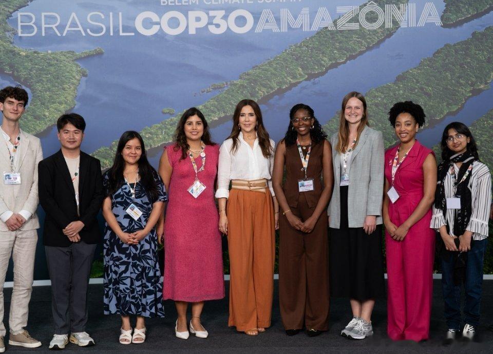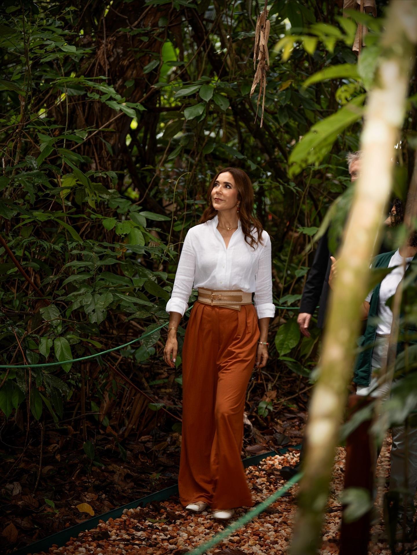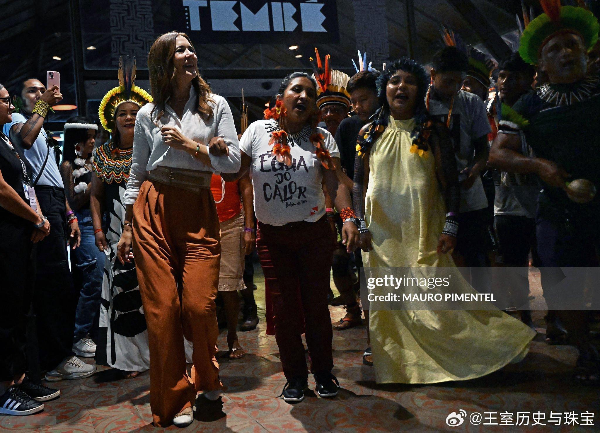 2025.11.12 丹麦王后玛丽继续访问巴西和出席联合国气候变化大会(COP30),还参观巴西农业中心,晚上出席在当地食品市场举办的晚宴,白色上衣来自Bagutta,旧印花裙来自Etro。