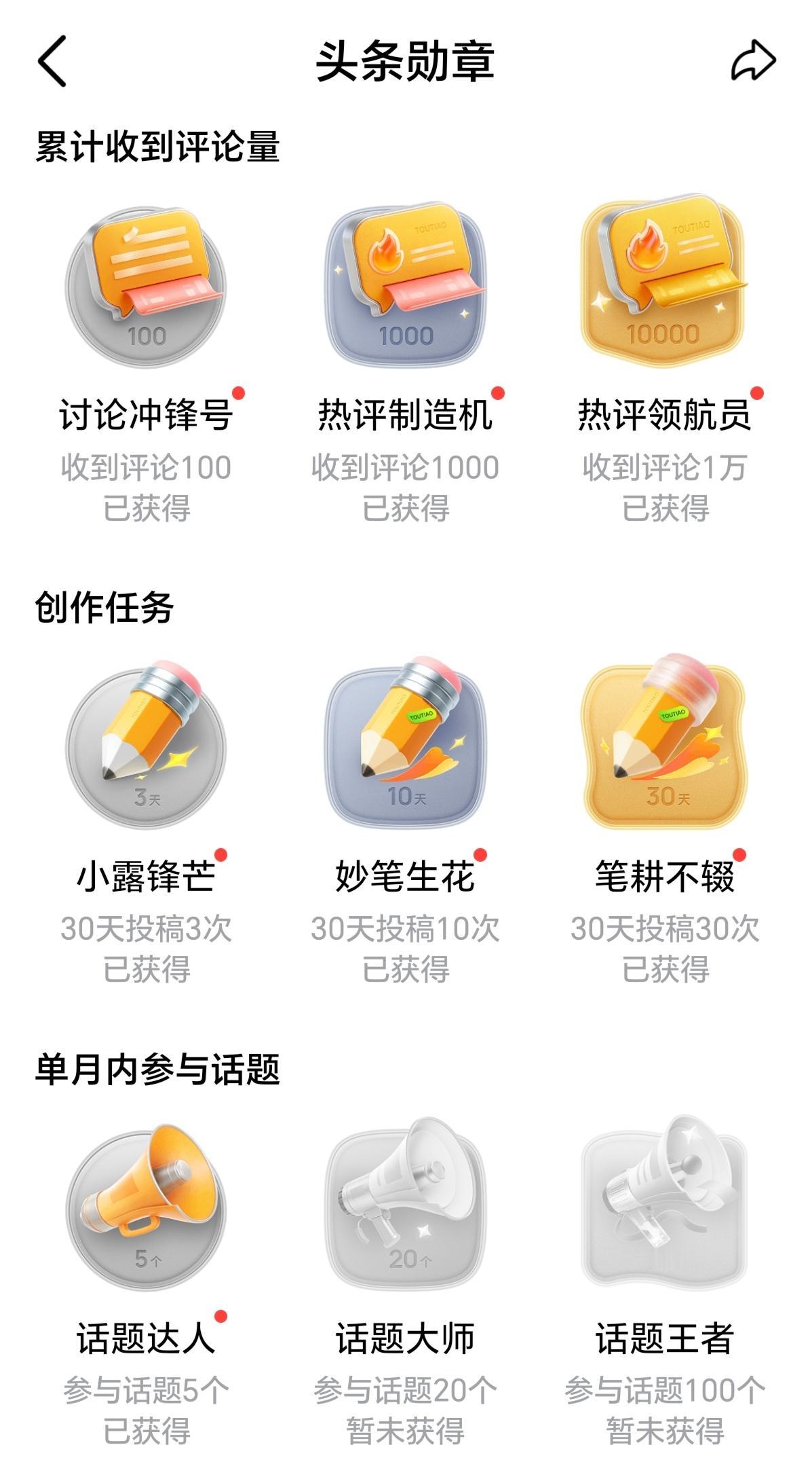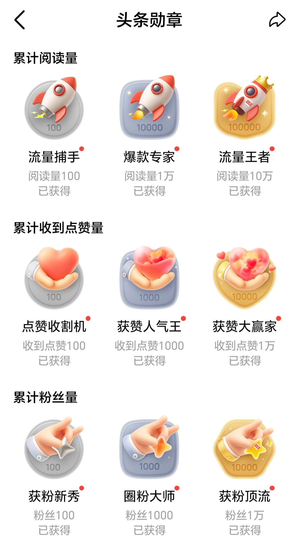 三年半,近5000万展现量。6500篇文章。自2022年5月,正式加入头条写作,通过努力,已公开发表5700篇文章。在已知的头条颁发的27枚勋章,已获得21枚勋章,已超过100%的头条条友(头条平台统计)。参与头条写作,并不是为了几文小钱(实话实说,就凭咱七十年代末你初中文化的写作水平,也没能力赚大钱)而是为了丰富自己的退休生活。和全国各地的条友探讨自己的喜怒哀乐,生活乐趣。今年初,一篇不是文章的文章,竟然获得了509万展现,(总展现量近5000万,阅读量1100万)55万阅读量,小费124元,就也是我在头条平台最大的一笔收入,至于六七十万,过百万的展现,几万阅读量的文章,也时不时出现。所有的一切,都与平台的鼓励和支持分不开的,所以,我将继续努力,不断提升自己的写作能力。目前为止,粉丝有20900,总收入是2100左右。