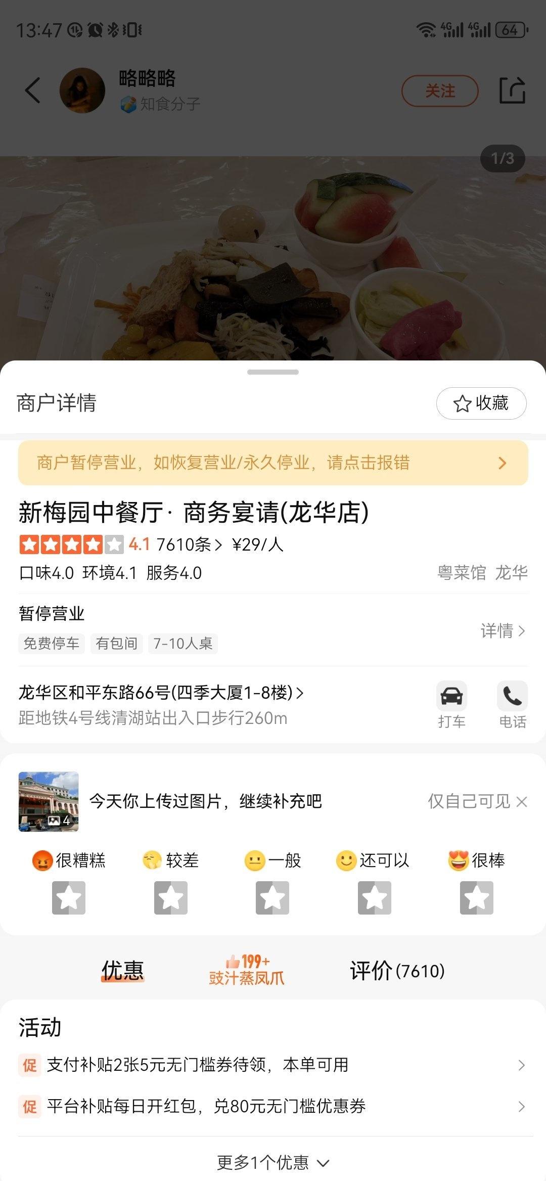 挂了一个牌子说酒店改造,但究竟是怎么改造?不得而知,1楼2楼好像都停了,素食自助在2楼。 搜了下大众点评,显示:暂停营业