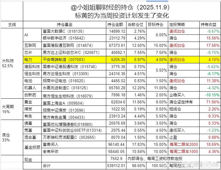 午评:腾讯、京东、中芯国际财报暴雷,引发今日大跌?昨天几大龙头公司公布了业绩,整体是超预期的,但为何今日市场大跌?我认为有几个原因,一是昨晚美联储放鹰,可能12月不降息,加上华尔街质疑AI泡沫,引发美股整体调整。二是短线资金跑路了,基本每次腾讯之类的公布财报,就会下跌,一般过几天就涨回来了。点评一下这几家的财报。腾讯业绩全面超预期,国外游戏部分,营收同比增长43%,非常优秀,因为基数大,堪比美股7姐妹,作为全球游戏的总舵主,腾讯迟早新高突破750,预计明年。哔哩哔哩没有腾讯那么强,但环比还是稳的,是少数还能接近10%增长的APP。营收同比+5%至77亿人民币有点惨,但毛利率连续13个季度提升,净利润率同比提升7%,大概率也是因为AI的应用降低了成本。京东Q3业绩比预期强一点,一个季度投了150亿在外卖上,经营利润变成了亏损11亿,自由现金流负120多亿。至于外卖和电商之间的联动,有一点但不多...由于国补的退潮,电商同比增速从上季度的20.6%降到了14.9%。如果未来国补停止,大概率增速会在5%以下。光从电商和物流角度看,京东一年能赚500亿左右,当前市值才3000多亿港币,已经非常便宜了。中芯国际Q3营收171.6亿,同比+9.9%,净利润15.2亿,同比+43.1%,即便按照比较便宜的港股来计算,目前也有80PE以上。对标台积电,不算贵。今日加仓1000元富国大数据(018135),最近AI方向都是高位震荡,主要是缺少利好刺激,总龙头英伟达还跌了,但段永平说买了英伟达,还没有减仓,所以我也继续加仓。科技爆发力很强,适合逢低布局,涨起来太快了追不上。今日加仓2000元易方达科创芯片(020671),芯片今天整体调整,高位回调了10%,今天买的这笔是划算的。易方达科创芯片今年涨56.41%,是同类产品中非常优秀的。今天调整是受美股大环境影响,昨天美股暴跌,市场质疑AI泡沫,腾讯资本开支下调,对国内AI应用来说,本质还是缺芯片,所以需求这一块并没有什么变化,主要还是情绪以及资金拥挤度较高,等待场外资金入场及调整充分,行情还会回来的。芯片我还是会加仓,先拿到年底看看。