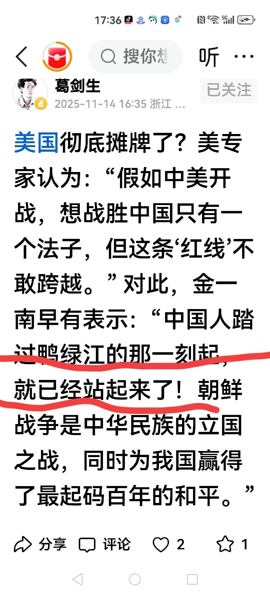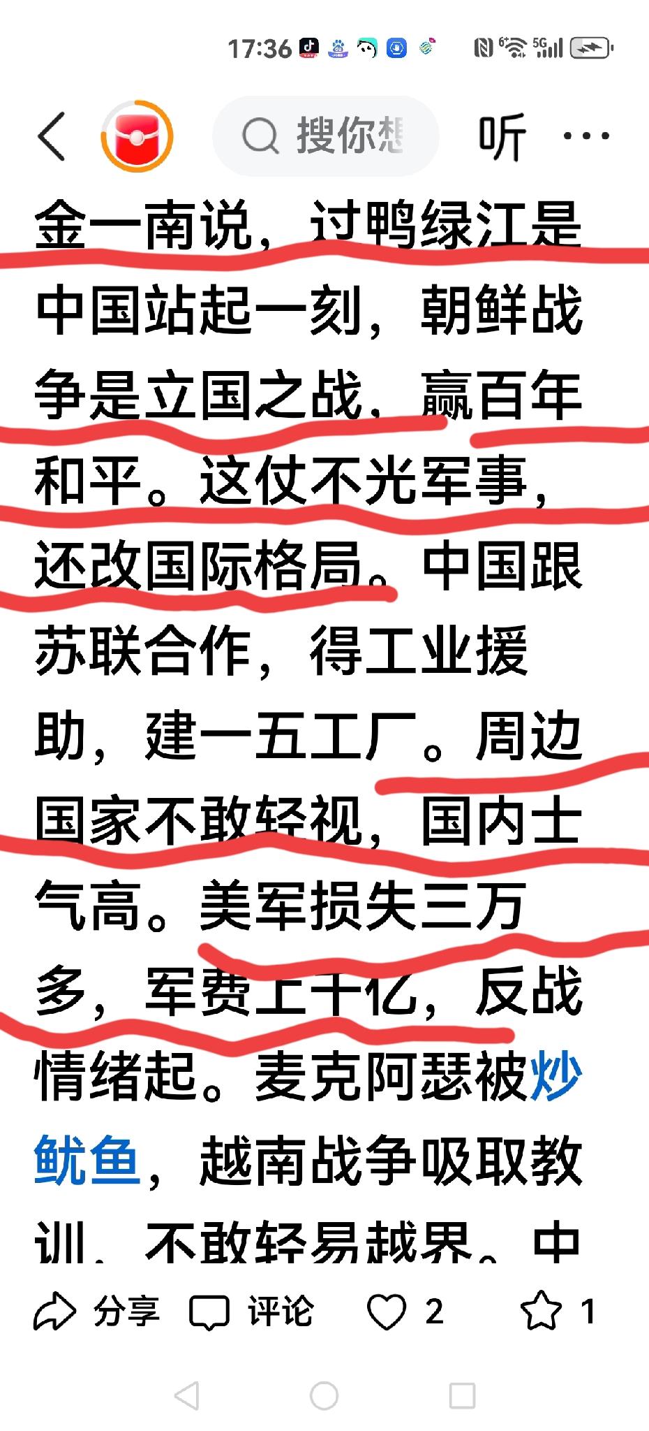 【金一南对朝鲜战争看法】 金一南:立国之战,换来百年和平。 不能看死亡人数,而是看意义重大。 换来与苏联合作,得到重工业支持,技术支持。 现实所存在: 朝鲜战争,我方出动290万人轮番上阵,最多在朝鲜高达135万志愿军。 付出19万生命,美国死亡5万多人,美国一直想不通我们为何说胜利? 长津湖战役,美陆战一师全身而退。 上甘岭战役,挡住美军,付出两个军代价。 更不提铁源,东川阻击战,更是惨烈。 到底换来和平,还是被西方制裁孤立? 假设不出兵,改革开放,与世界交流,又如何?