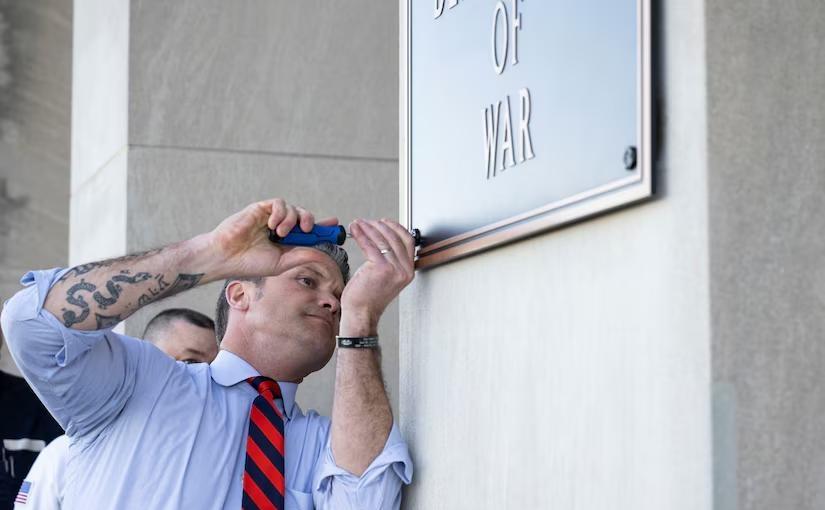 【五角大楼悬挂重27公斤新命名部门标牌】五角大楼建筑上悬挂超过70年的旧青桐标牌已被更换成写着"战争部"的新标牌,这是该机构现在的官方名称。据战争部发布的消息,战争部长皮特·赫格塞思将最后一颗螺丝拧入了其中一块标牌。当前名称反映了该部门的新精神。每块标牌重达27公斤,尺寸约为75×50厘米。 据美国全国广播公司新闻台(NBC News)此前报道,美国国防部的更名工作可能耗资20亿美元。今年九月初,美国总统特朗普签署行政令,将国防部更名为战争部。他表示考虑到当前国际形势,这个名称更合适。 图片:战争部
