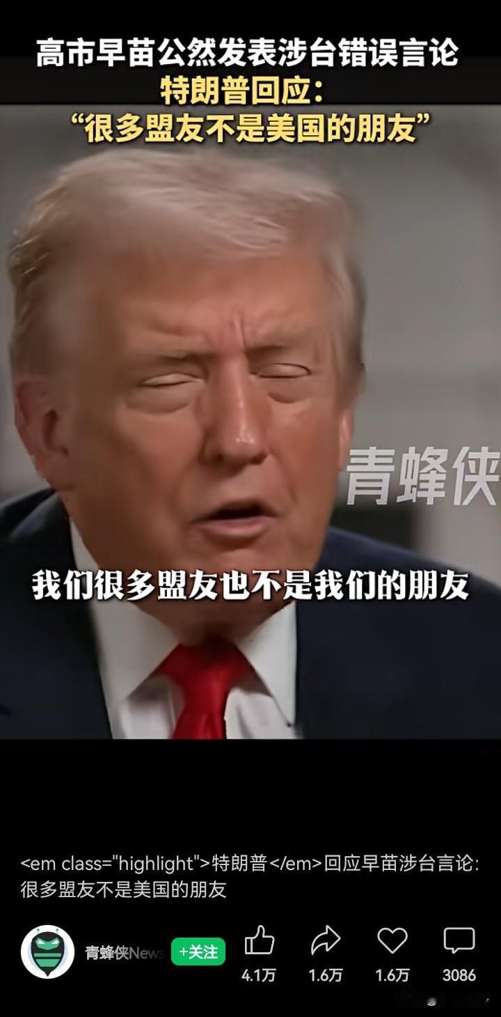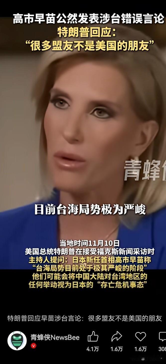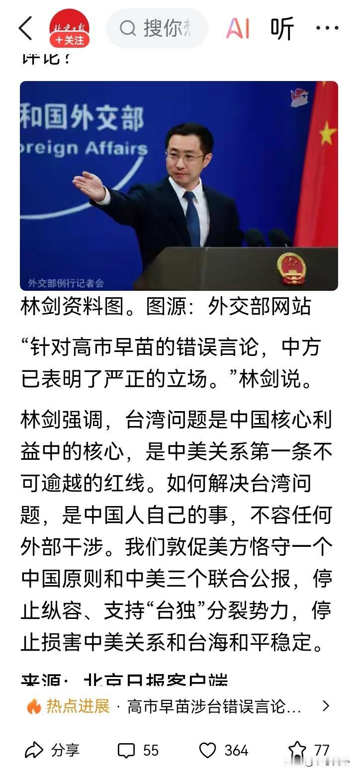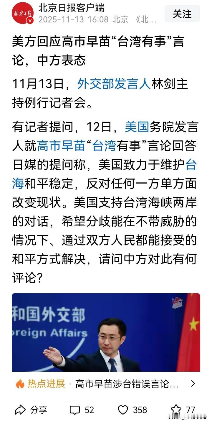 高市早苗乱喷后,美国也没有惯着她,对我们说话也比较柔和,但是,中国还是坚定地表达了自己的立场,这也说明,中国真的怒了! 特朗普接受采访时,表示,“我们的很多盟友也不是我们的朋友”,言下之意,日本是盟友(自己也和高市早苗前些天见面,相谈甚欢),但不是朋友…… 美国务院发言人就高市早苗"台湾有事"言论回答日媒的提问时,回答的内容也不敢对中方强硬! 外交部发言人林剑对此回应时则强调,“如何解决台湾问题,是中国人自己的事,不容任何外部干涉。” 只能说,台湾是我们的核心利益。高市早苗的挑衅,中国确实怒了!面对发怒的中国,美国也是要掂量后果的,何况小本子!