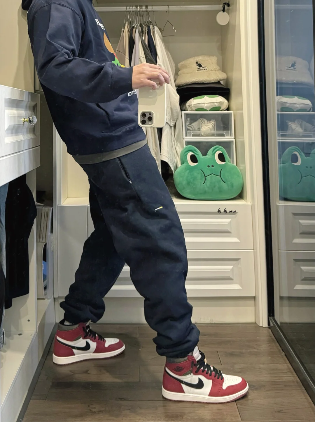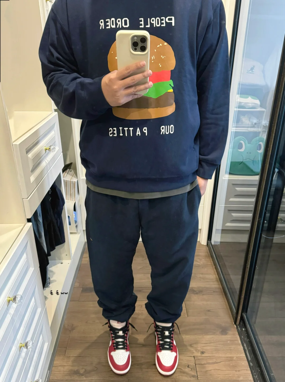 -本期海军蓝穿搭,整套同色藏青还是很有亲和力,喜欢深蓝色的小伙伴不妨一试 . -连帽卫衣叠穿,搭配宽松的束口卫裤,最后选一双球鞋,呼应汉堡印花的配色 . —————— . ✏️本人178cm75kg 球鞋尺码265mm(正常EU42) . 💭以上均为我个人观点,不喜勿喷,欢迎讨论