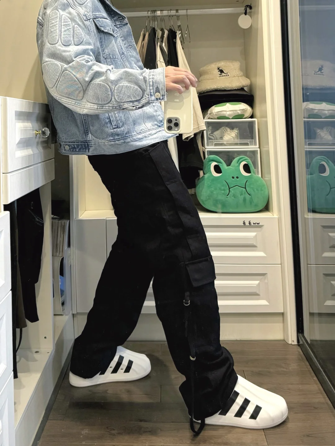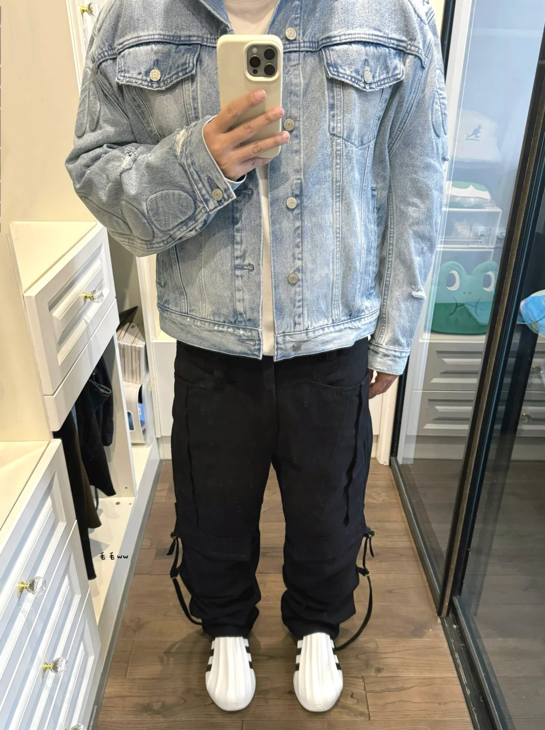 -本期对比色穿搭,浅色牛仔外套搭配深色工装裤,对比度高呈现出的效果也明显 . -小细节特别吸引我,外套的铠甲鳞片,裤装的抽绳绑带,同样有收紧裤脚的作用 . —————— . ✏️本人178cm75kg 球鞋尺码265mm(正常EU42) . 💭以上均为我个人观点,不喜勿喷,欢迎讨论。
