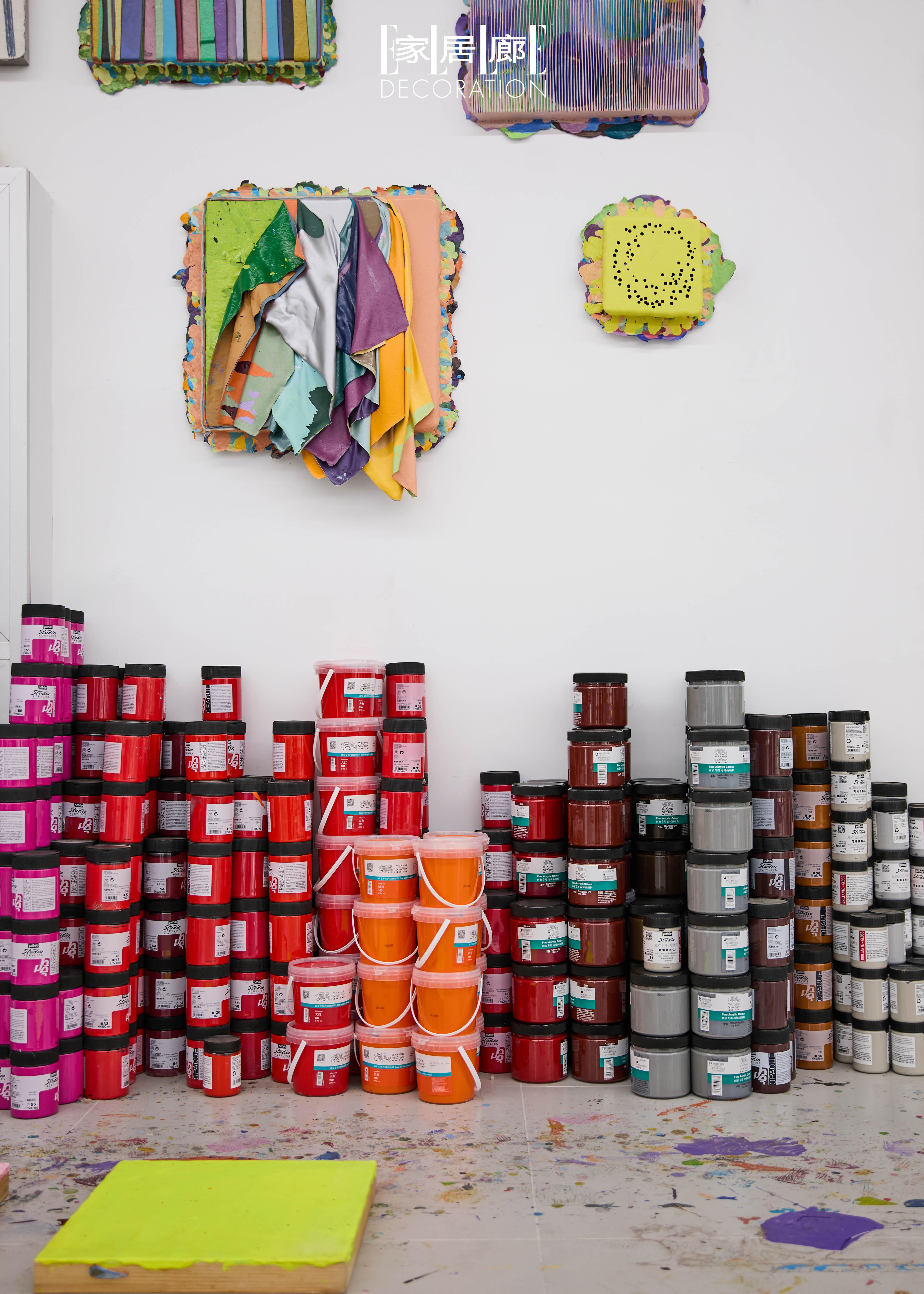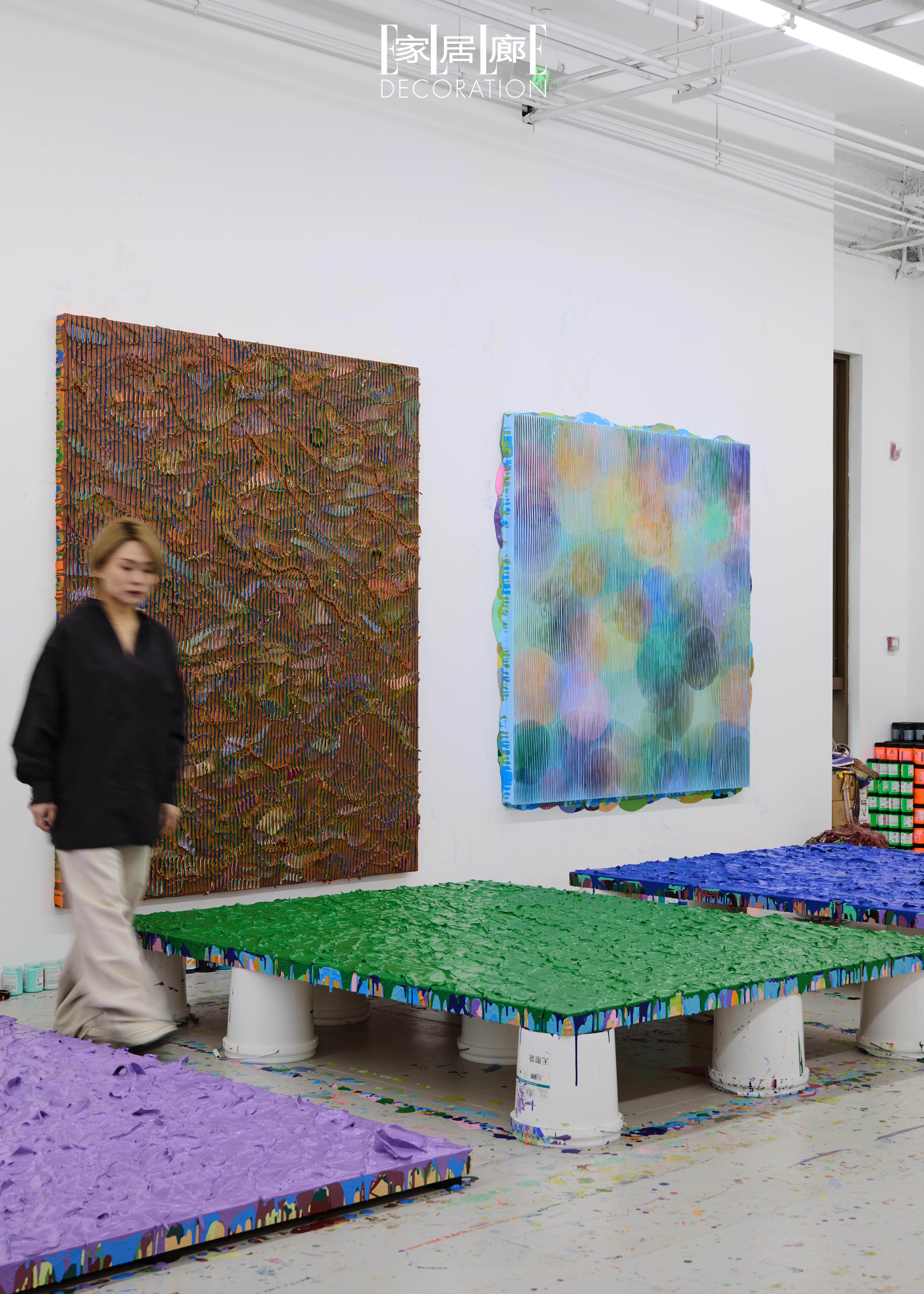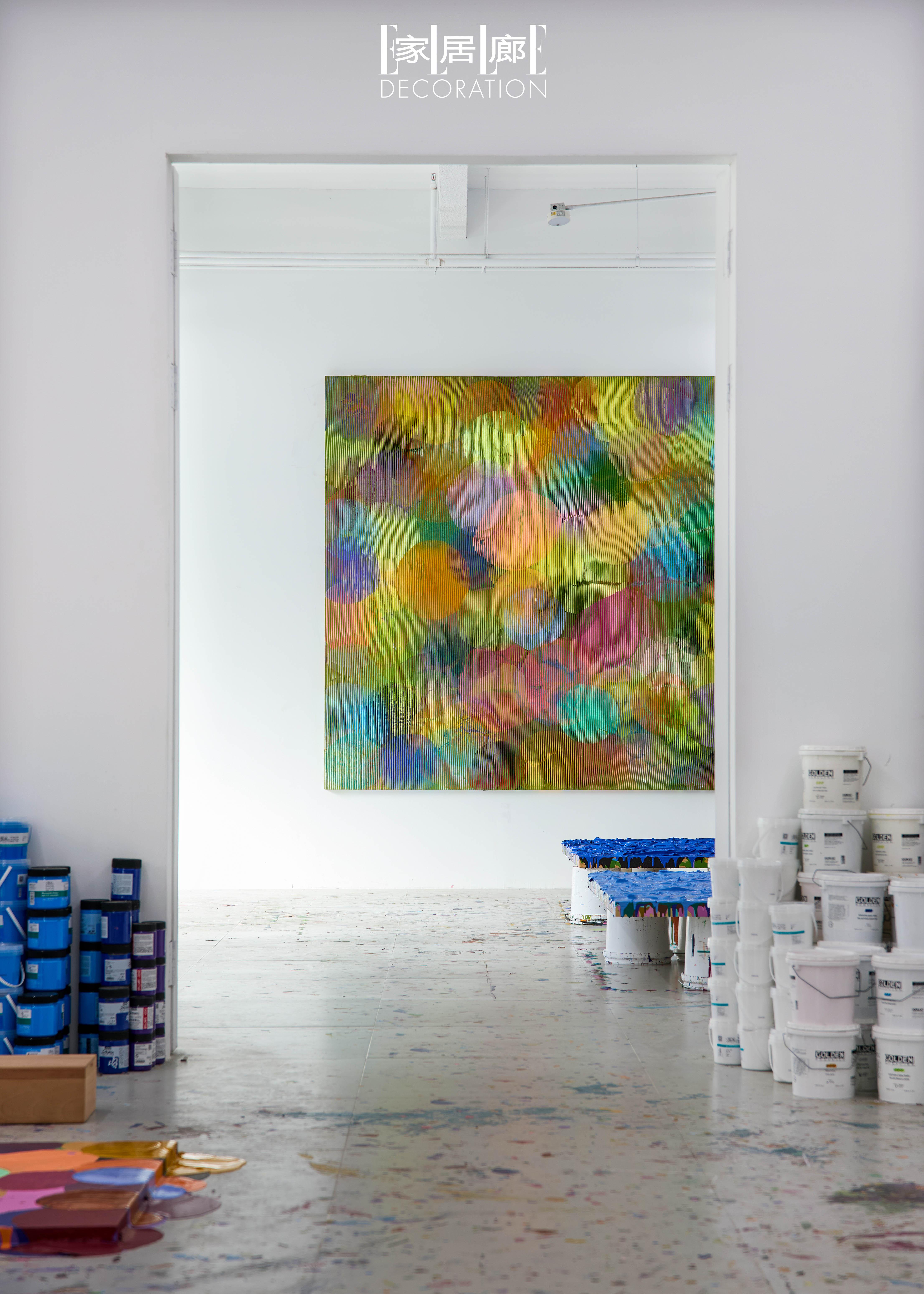 鞠婷刻刀下的温柔叙事与暴烈美学。推开鞠婷工作室的大门,就像一下子踏进了光里。空间尽头,一幅巨大的《琥珀》在空气里呼吸:一簇簇雾化的圆形并置在同一平面起伏,表面又被纵向细痕轻轻拉直,像把奔涌的水面稍稍安抚。地面遍布溅点与试样,墙边按冷暖与明度码得严丝合缝的颜料桶,从脚边排到腰际,像一条耐心生长的色彩山脊。四处散落着一块块被时间覆写的地层切片:厚厚的丙烯在台面、桶沿、工具手柄上反复沉积,形成肉眼可见的年轮。