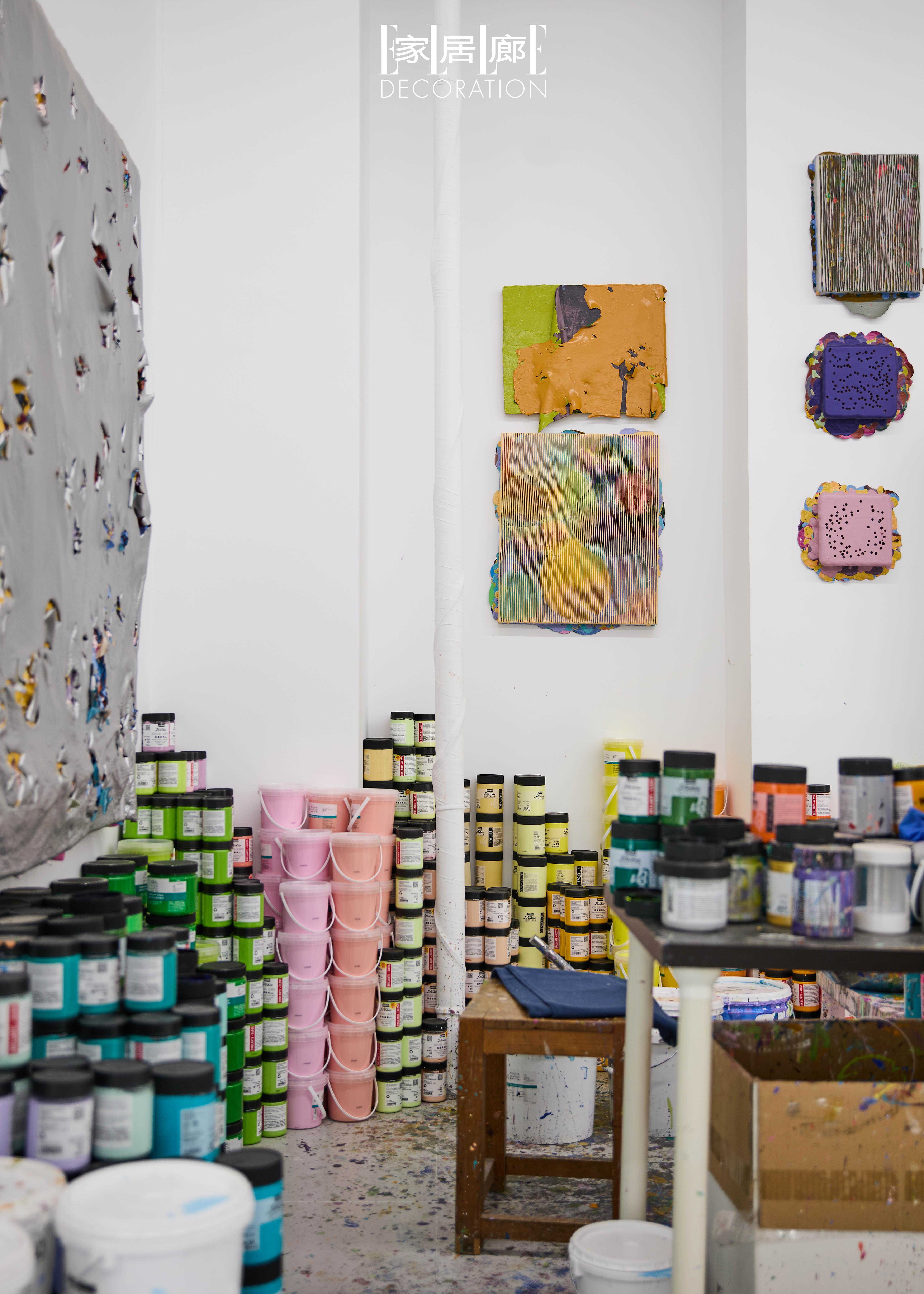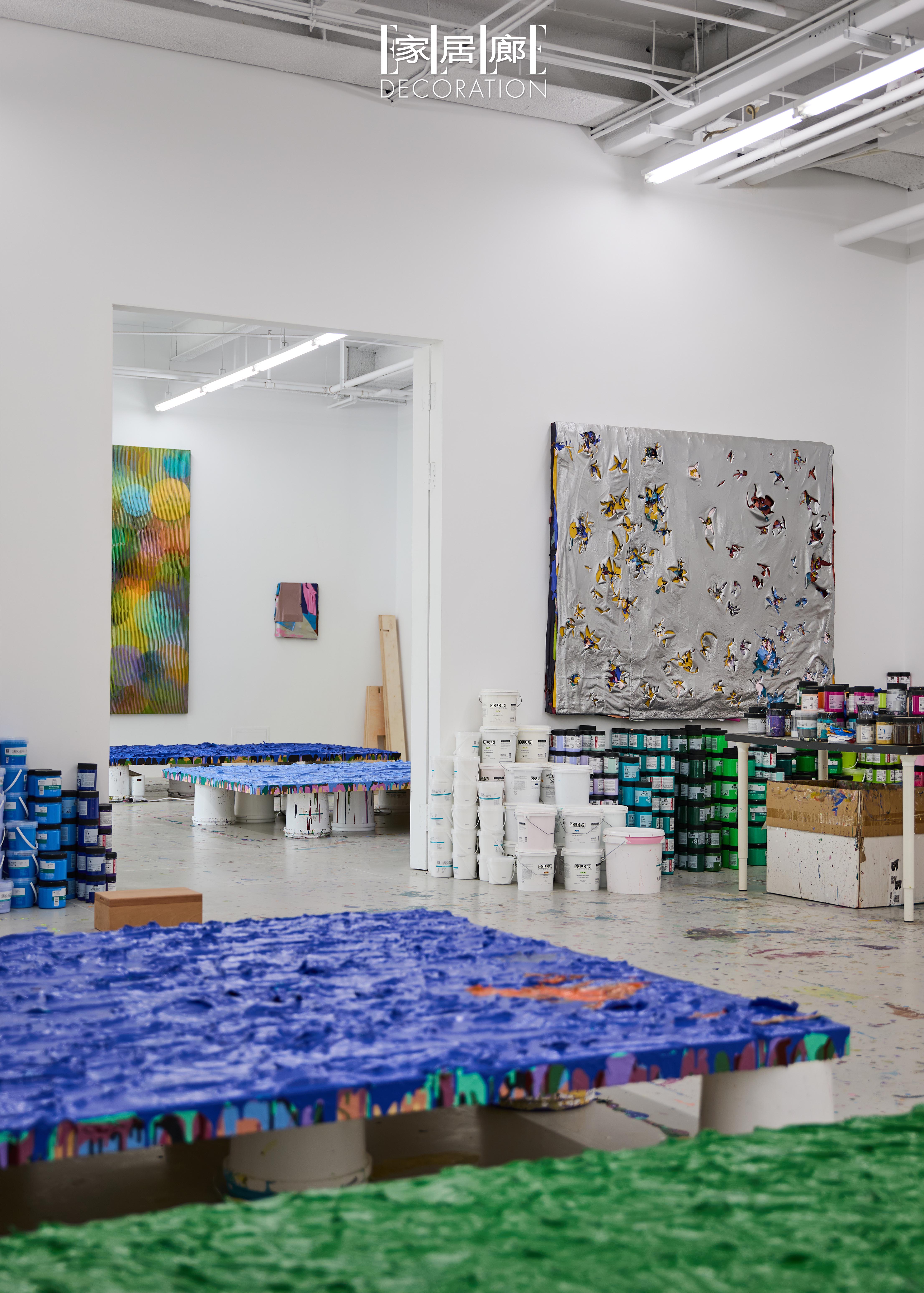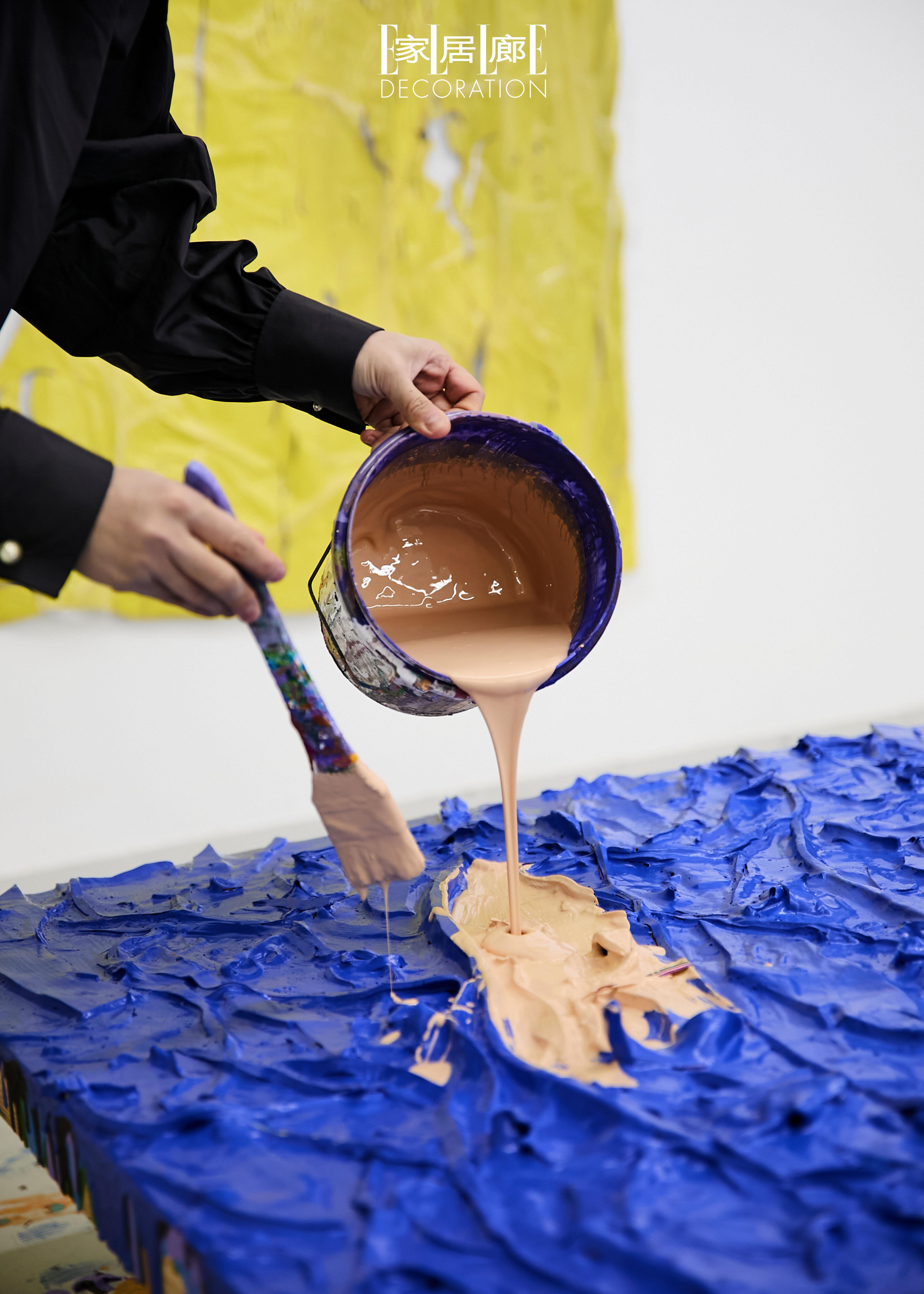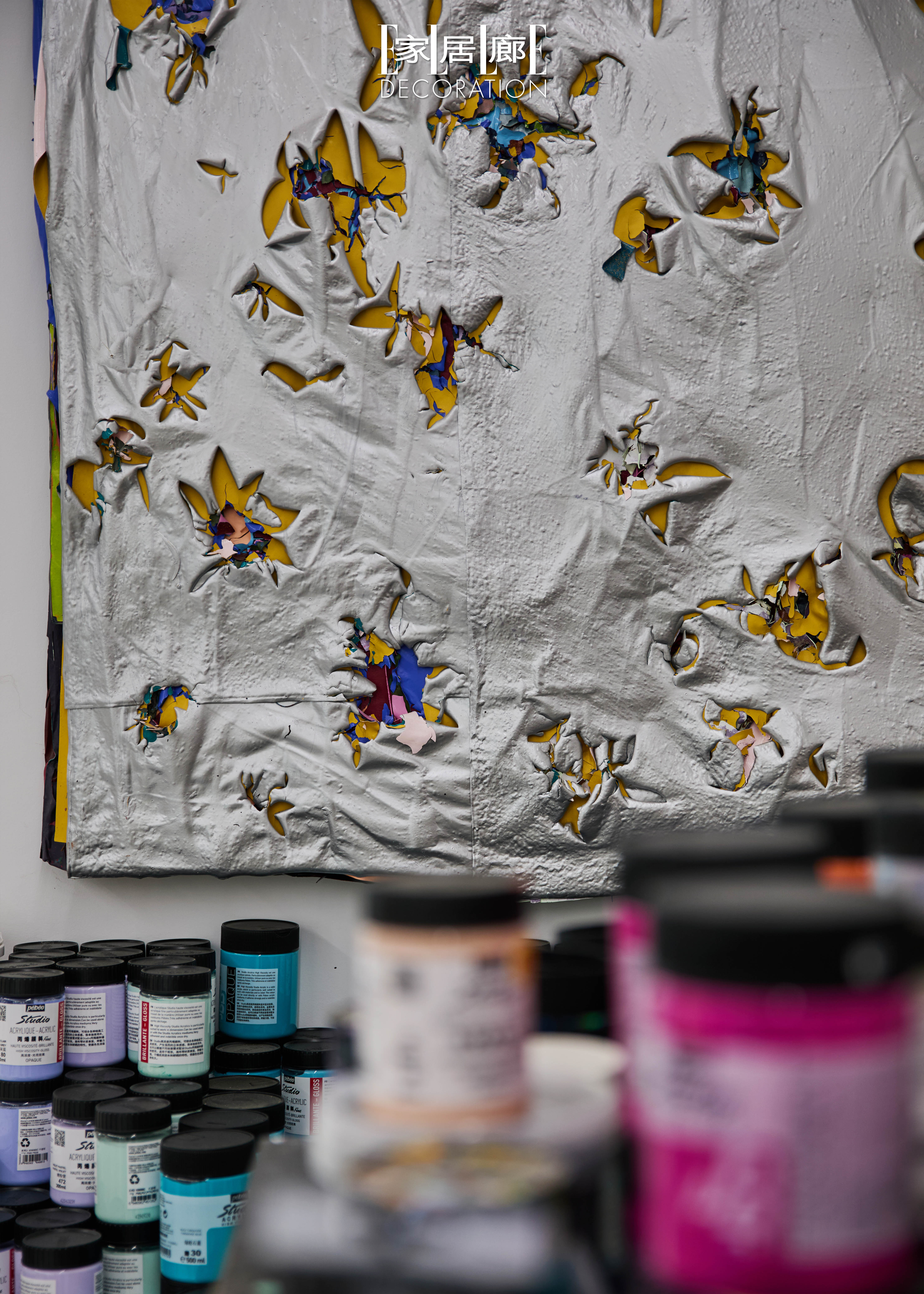 鞠婷刻刀下的温柔叙事与暴烈美学。推开鞠婷工作室的大门,就像一下子踏进了光里。空间尽头,一幅巨大的《琥珀》在空气里呼吸:一簇簇雾化的圆形并置在同一平面起伏,表面又被纵向细痕轻轻拉直,像把奔涌的水面稍稍安抚。地面遍布溅点与试样,墙边按冷暖与明度码得严丝合缝的颜料桶,从脚边排到腰际,像一条耐心生长的色彩山脊。四处散落着一块块被时间覆写的地层切片:厚厚的丙烯在台面、桶沿、工具手柄上反复沉积,形成肉眼可见的年轮。